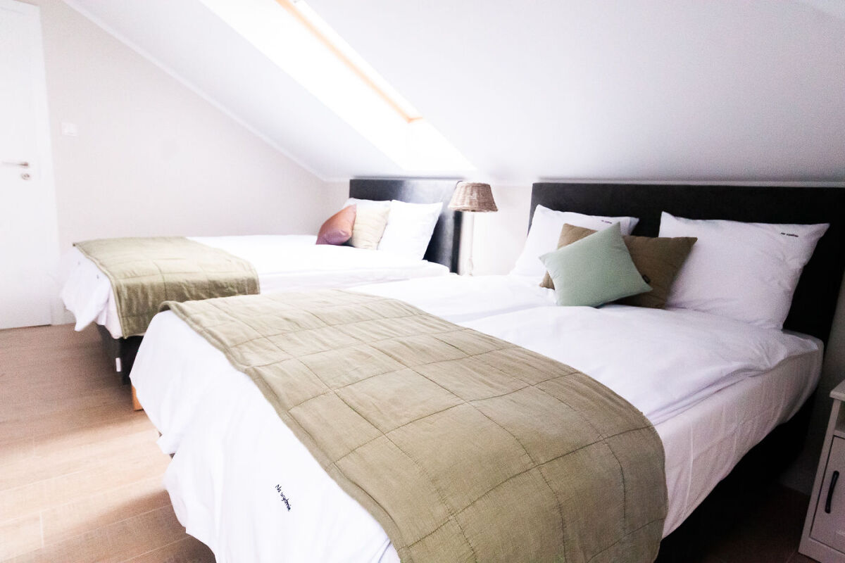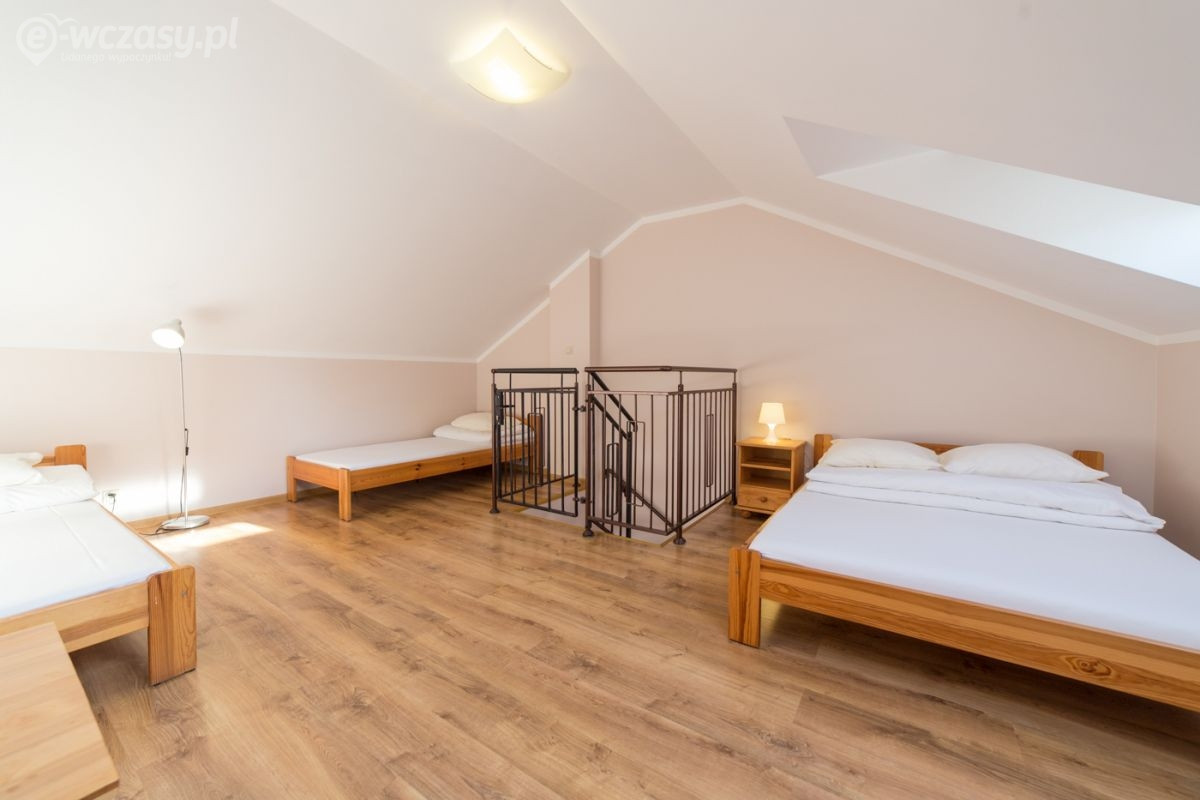 Pokój Family Plus - pokoje są dwupoziomowe, 2-6 osobowe o powierzchni ok. 40 m². Znajdują się na pierwszym piętrze w budynku A. Na dolnej kondygnacji jest łazienka, telewizor LCD, Wi-Fi, lodówka, szafa, stół kawowy, fotel oraz rozkładana wersalka 2-osobowa. Na górną kondygnację – antresolę prowadzą kręcone schody zamykane bramką. Przed pokojami znajdują się meble ogrodowe (stolik + 2 krzesła).