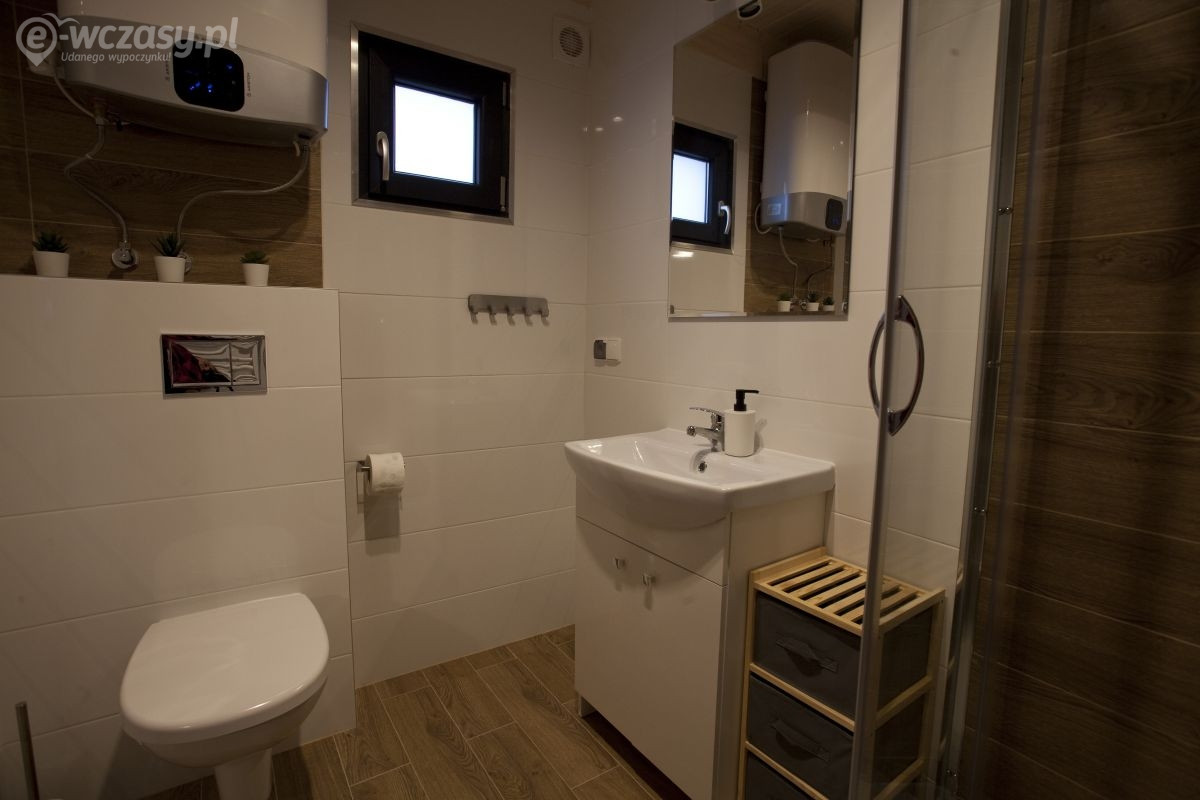 Na piętrze znajdują się: 2 oddzielne sypialnie, na dole w salonie dodatkowo duża rozkładana wygodna kanapa, aneks kuchenny, łazienka, TV-sat, wyjście na taras.