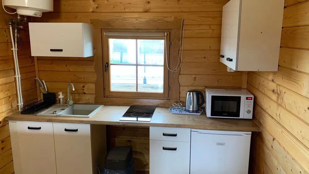 Aneks kuchenny został wyposażony we wszystko, co potrzebne do przygotowania posiłków: dwupalnikową płytę ceramiczną, kuchenkę mikrofalową, lodówkę (bez zamrażarki), czajnik elektryczny oraz komplet naczyń, garnków, sztućców i patelnię.