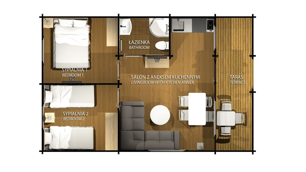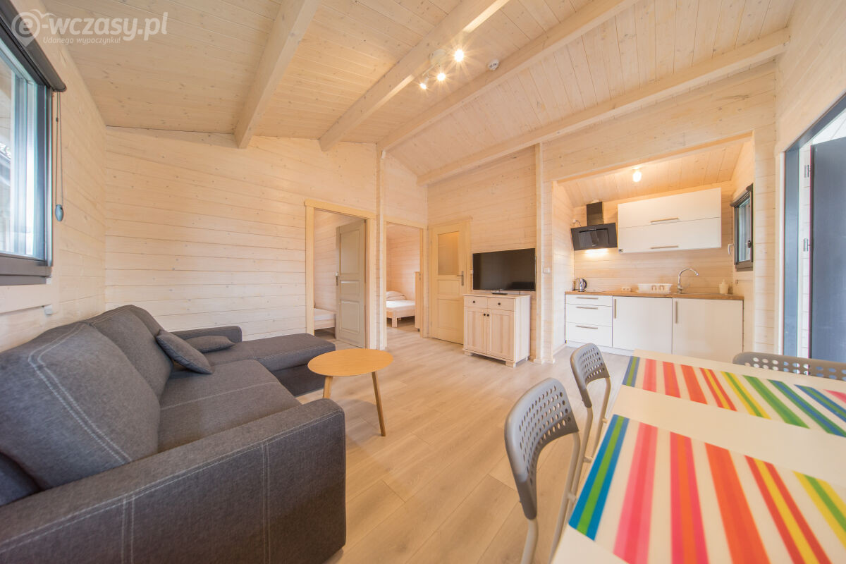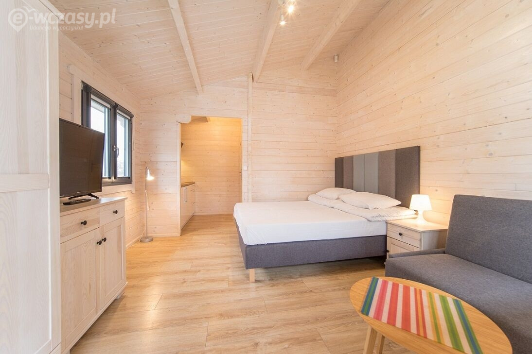- Przestronne domki parterowe i piętrowe (2-8 os.) – z aneksem kuchennym, werandą i nowoczesną łazienką.