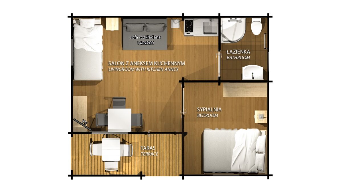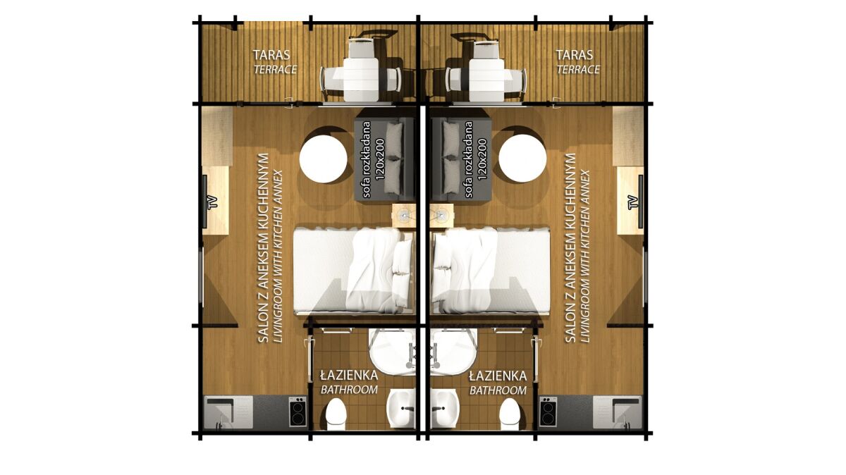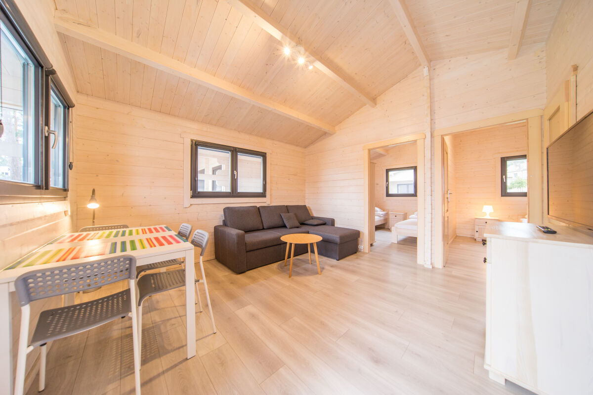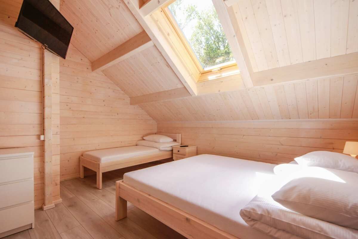- Przestronne domki parterowe i piętrowe (2-8 os.) – z aneksem kuchennym, werandą i nowoczesną łazienką.