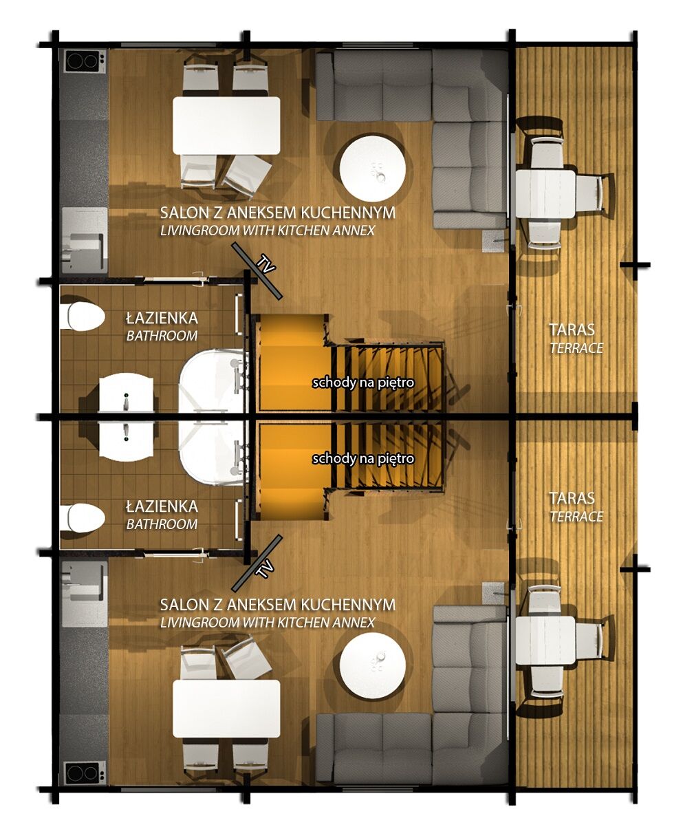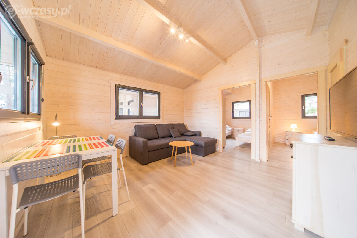 - Przestronne domki parterowe i piętrowe (2-8 os.) – z aneksem kuchennym, werandą i nowoczesną łazienką.