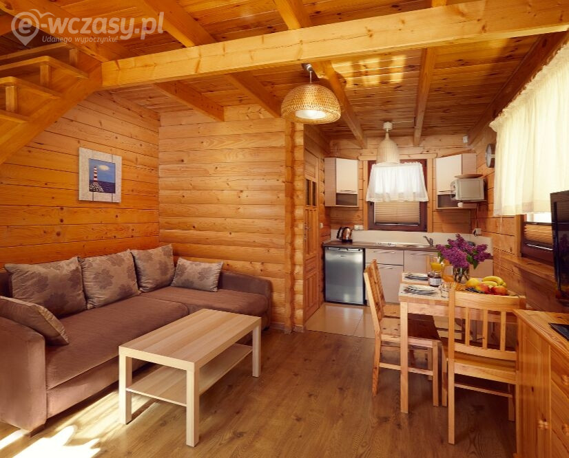 - Salon wyposażony jest w stół jadalniany z kompletem krzeseł, telewizor oraz kanapę, natomiast aneks kuchenny bez problemu pozwoli przygotować każdy posiłek dzięki lodówce, czajnikowi, kuchence mikrofalowej i płycie grzewczej. W szafkach znajdują się również sztućce, talerze oraz garnki i patelnie, dodatkowo dla większego komfortu, domek wyposażony jest w zmywarkę oraz ogrzewanie podłogowe.