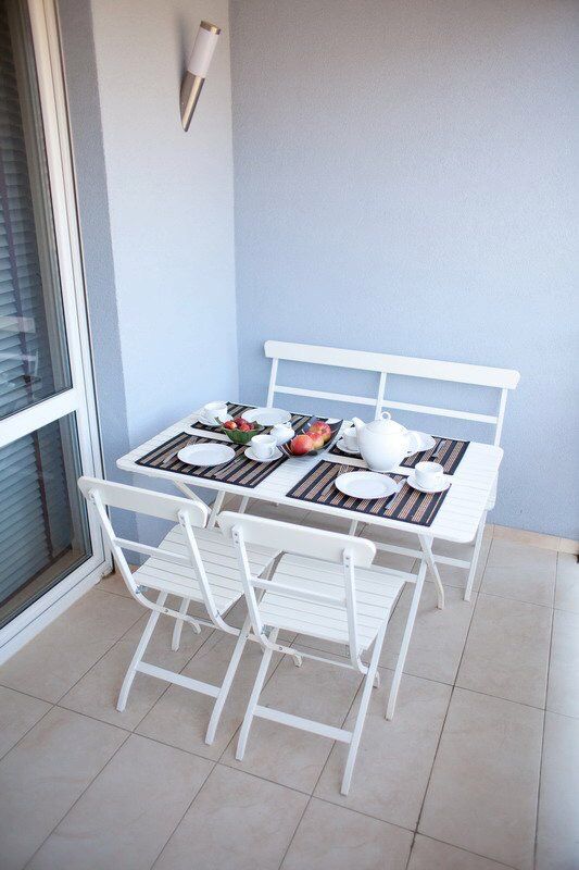 salon z rozkładanym 2-osobowym narożnikiem, dostawka 80x200, 32calowy telewizor LCD, kuchnia w pełni wyposażona, stolik z hokerami, szafa w przedpokoju, umeblowana loggia