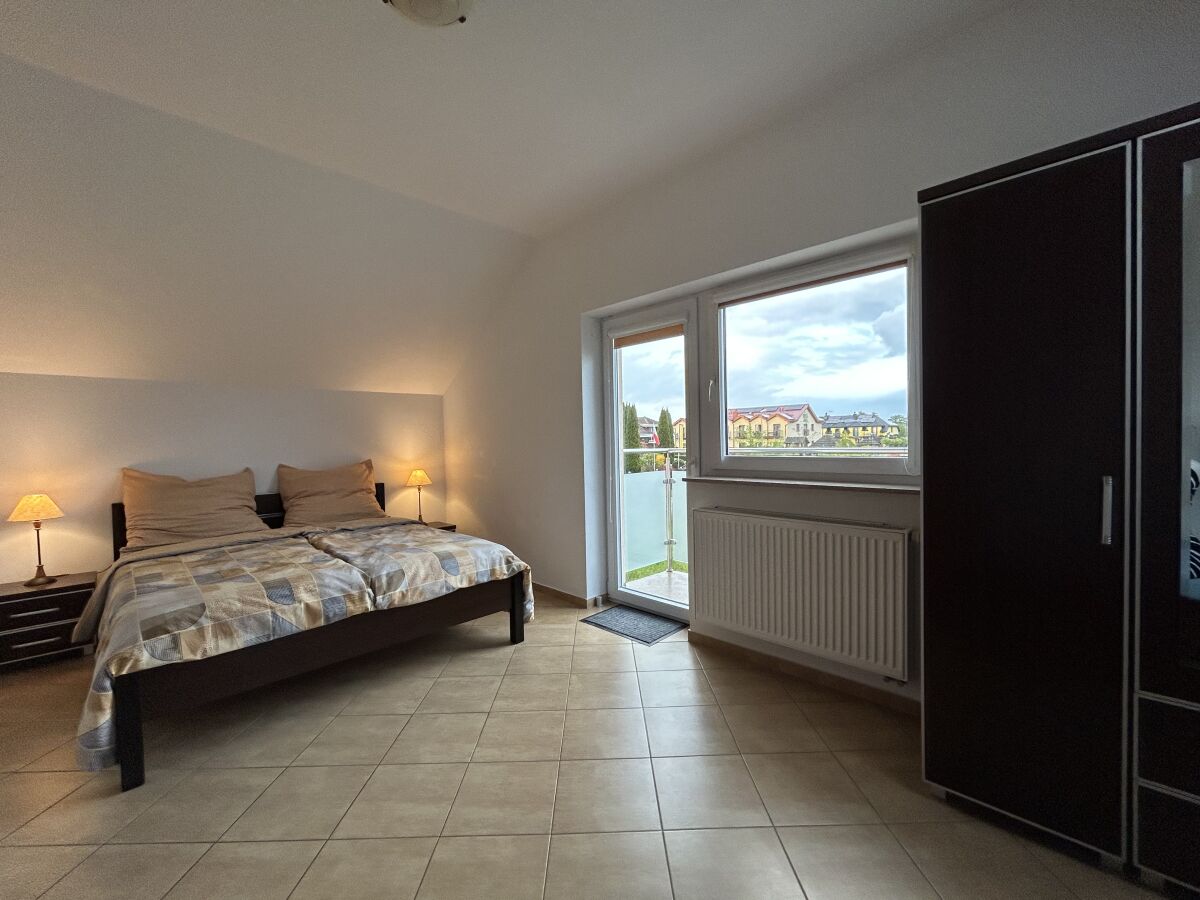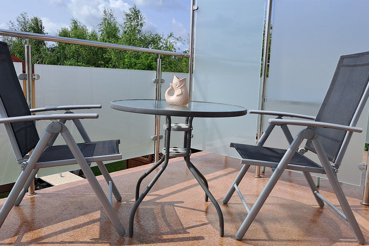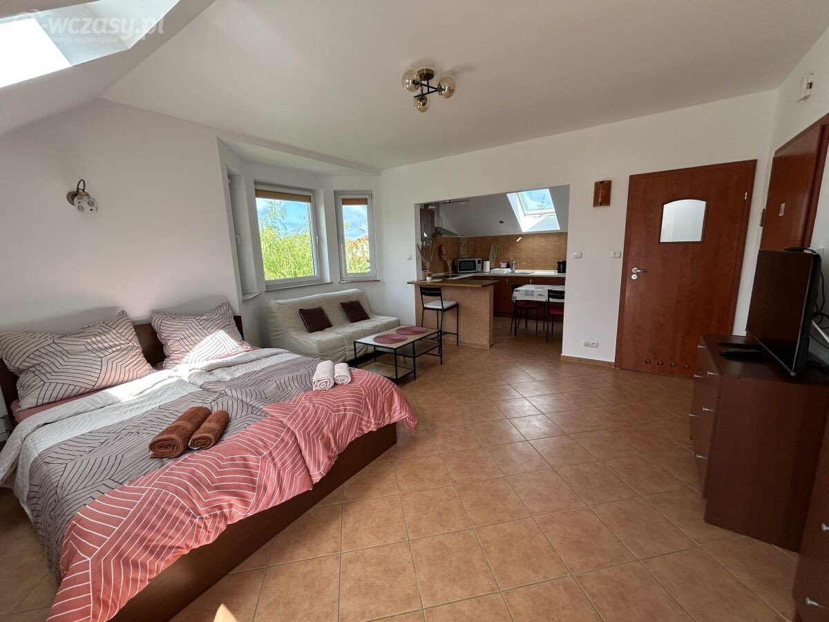 Przestrzeń mieszkalno-sypialna z łóżkiem podwójnym i rozkładaną sofą, TV, w pełni wyposażona kuchnia ze zmywarką, kuchenny blat z miejscem do jedzenia dla 2 osób, dodatkowo stół jadalny dla 3 osób, łazienka z wanną z siedziskiem, balkon.