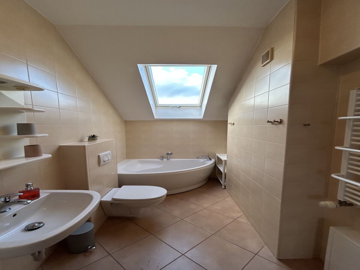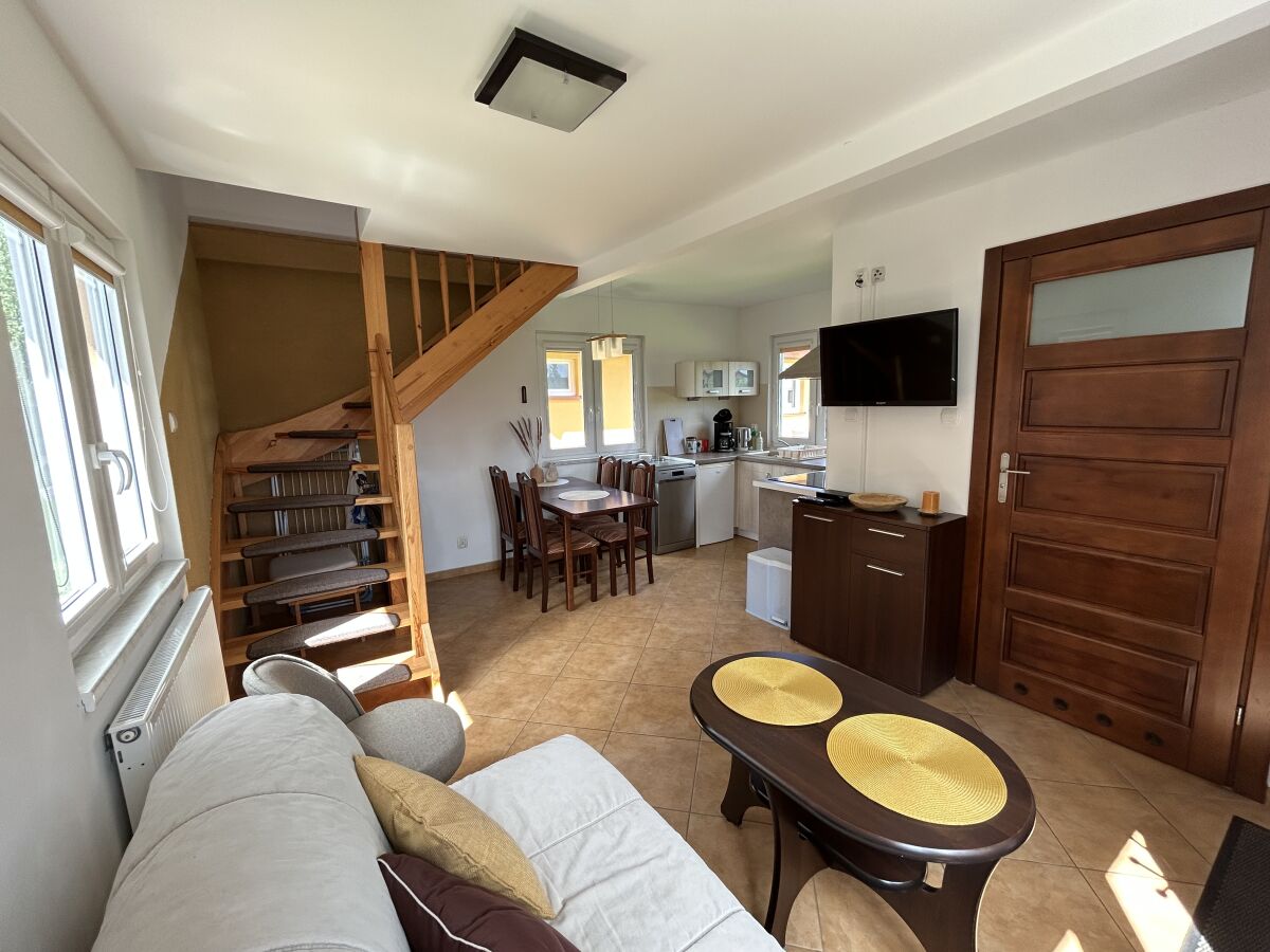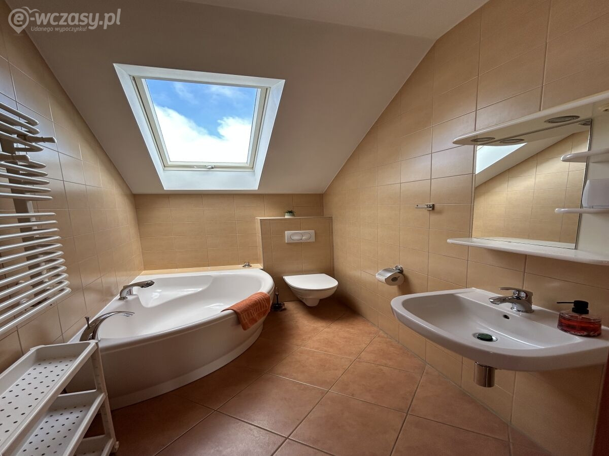 Na parterze: salon z rozkładaną sofą, TV, stół jadalny dla 5 osób, w pełni wyposażona kuchnia ze zmywarką, łazienka z prysznicem, ogrzewanie podłogowe. Na górze: sypialnia z łóżkiem podwójnym i dwoma pojedynczymi łóżkami. Zabezpieczenie schodów dla dzieci.