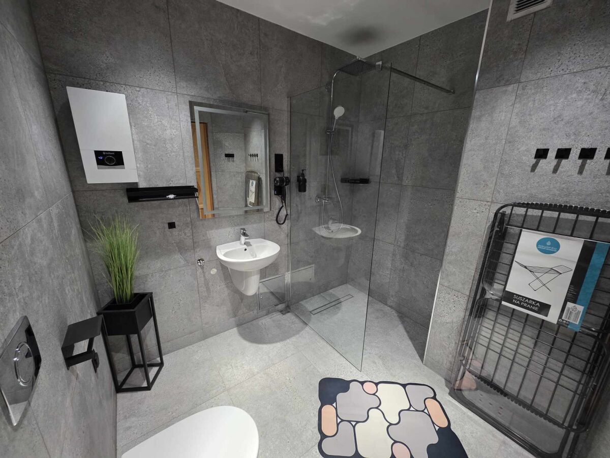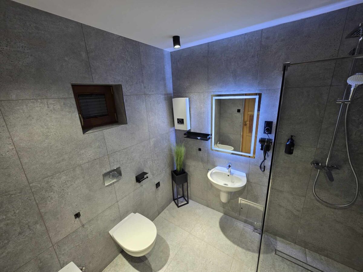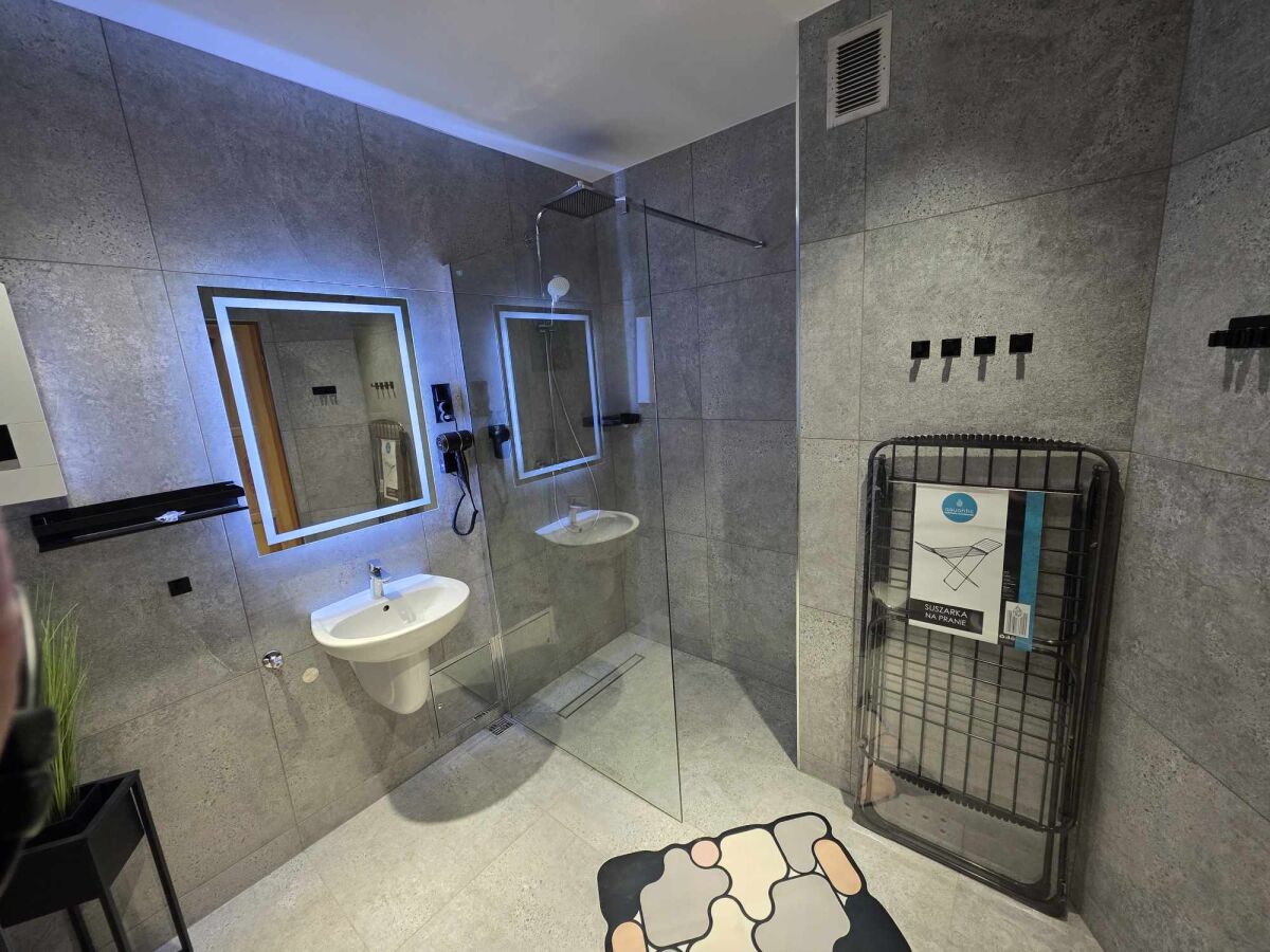 Łazienka: kabina prysznicowa, umywalka, bidet, WC, suszarka do włosów.