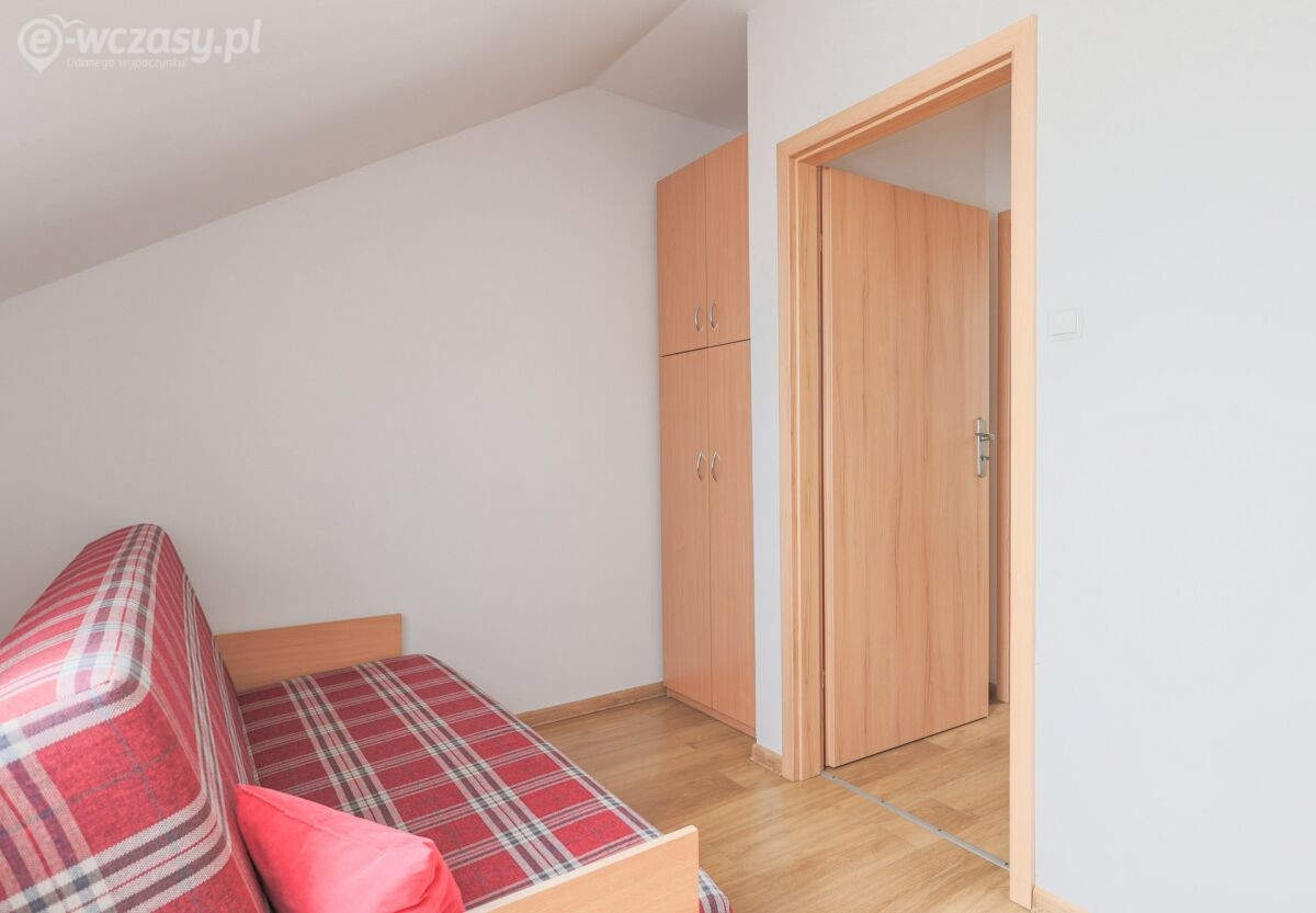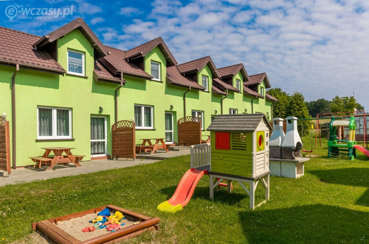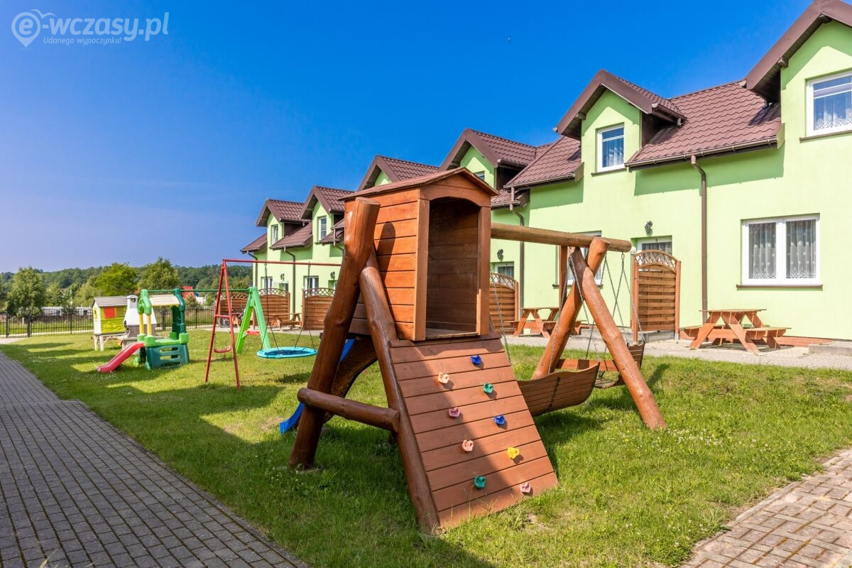 W aneksie kuchennym do Państwa dyspozycji oddajemy lodówkę, płytę kuchenną, komplet garnków, przybory kuchenne, czajnik,kuchenkę mikrofalową, oraz zastawę stołową dla 6 osób(dostawka w zależności od ilości osób). Na piętrze znajdują się dwie sypialnie, w tym jedna z łożem małżeńskim +kanapa dwuosobowa w drugiej znajdują się dwie kanapy rozkładana dwuosobowe. Poza tym sypialnie wyposażone są w szafki nocne, kołdry, poduszki, oraz pościel. Przed domkiem znajduje się ławostół . Ponadto każdy domek wyposażony jest w parawan, żelazko oraz deskę do prasowania . Plac zabaw zadowoli starsze i młodsze dzieci (zestawy huśtawek dla małych oraz większych dzieci, piaskownica,domki, zabawki, zjeżdżalnie .