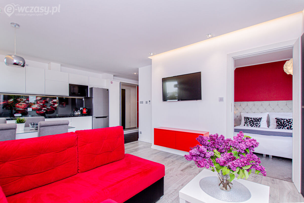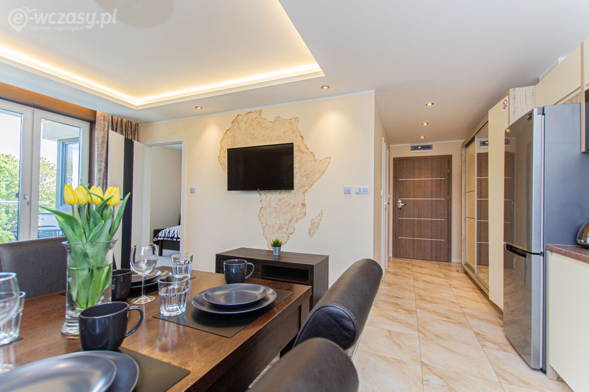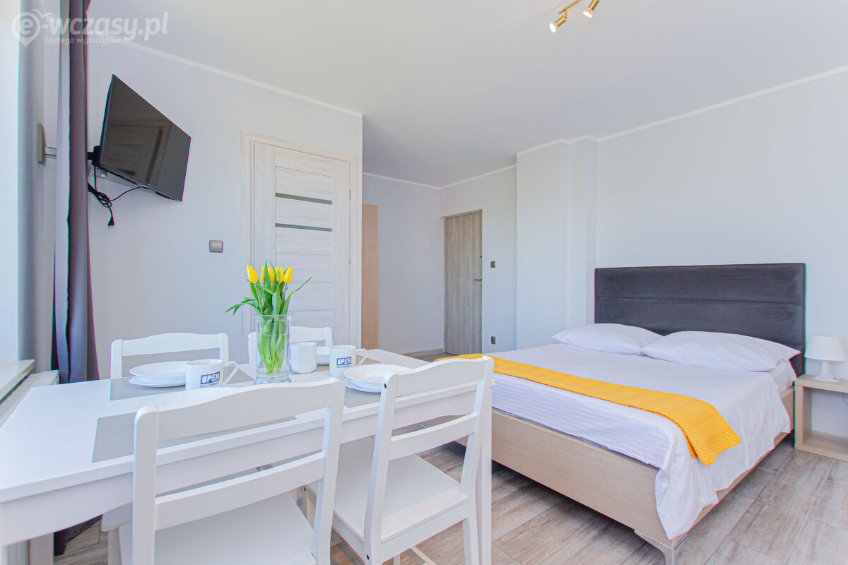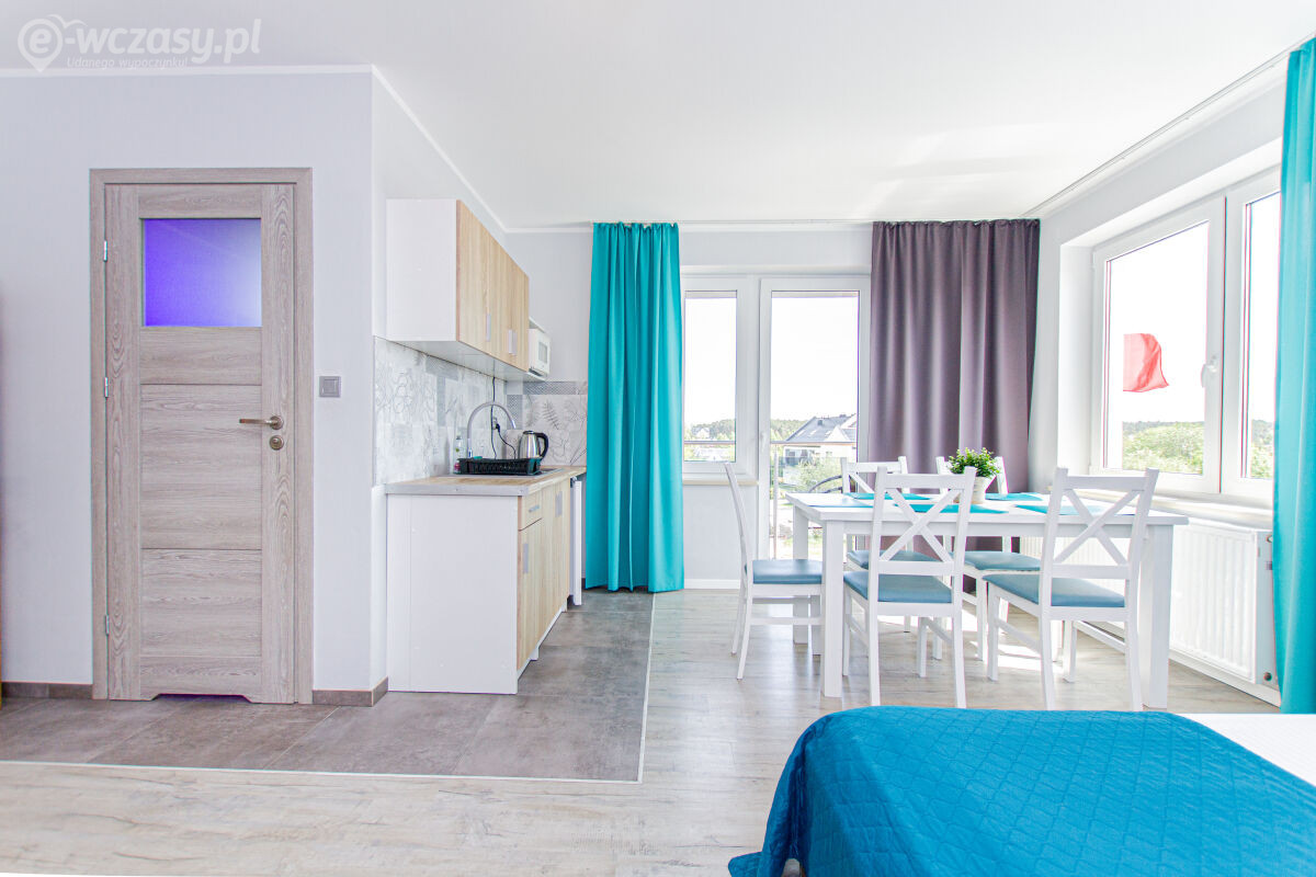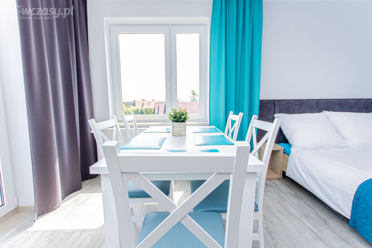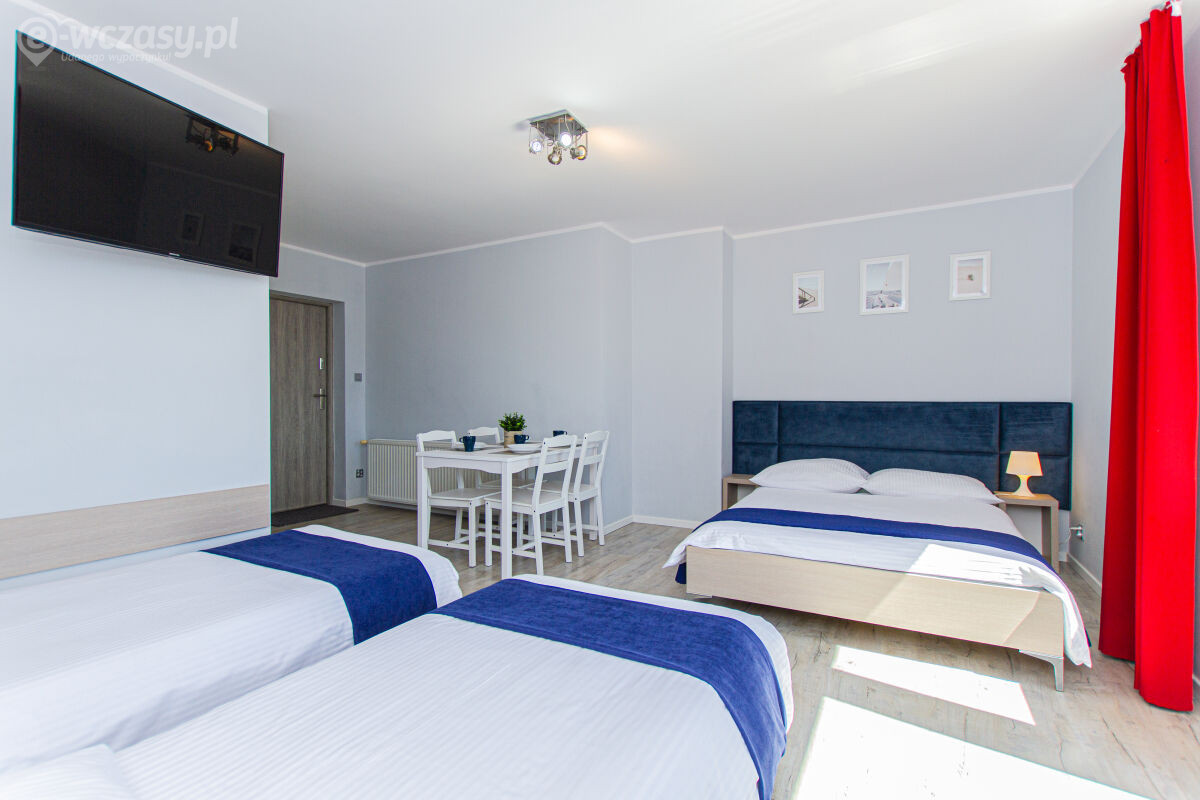 Apartamenty urządzone tematycznie ,każdy o pow. 44 m/kw , każdy,2 pokojowy - 3/5 os z kuchnią wyposażona; w lodówke z zamrażarką , czajnik, naczynia ,płyta indukcyjna , garnki , mikrofala , zmywarka + kapsułki ,w salonie rozkładany narożnik z możliwością spania, tv z smart , oddzielna sypialnia ,w którejznajduje sięłoże małżeńskie 160 cm z możliwością oddzielnego spania dla dzieci + fotel rozkładany ; łazienka : na wyposażeniu ręczniki mydło ,suszarka , deska do prasowania, suszarka na pranie , parawan , koc , leżaki na plaże , balkon -krzesła+ stolik ; w wybranych apartamentach klimatyzacja.