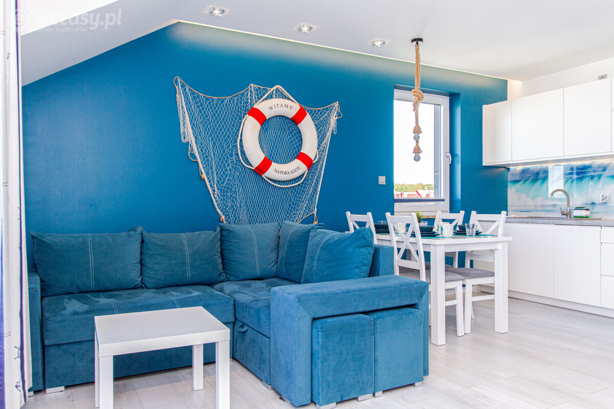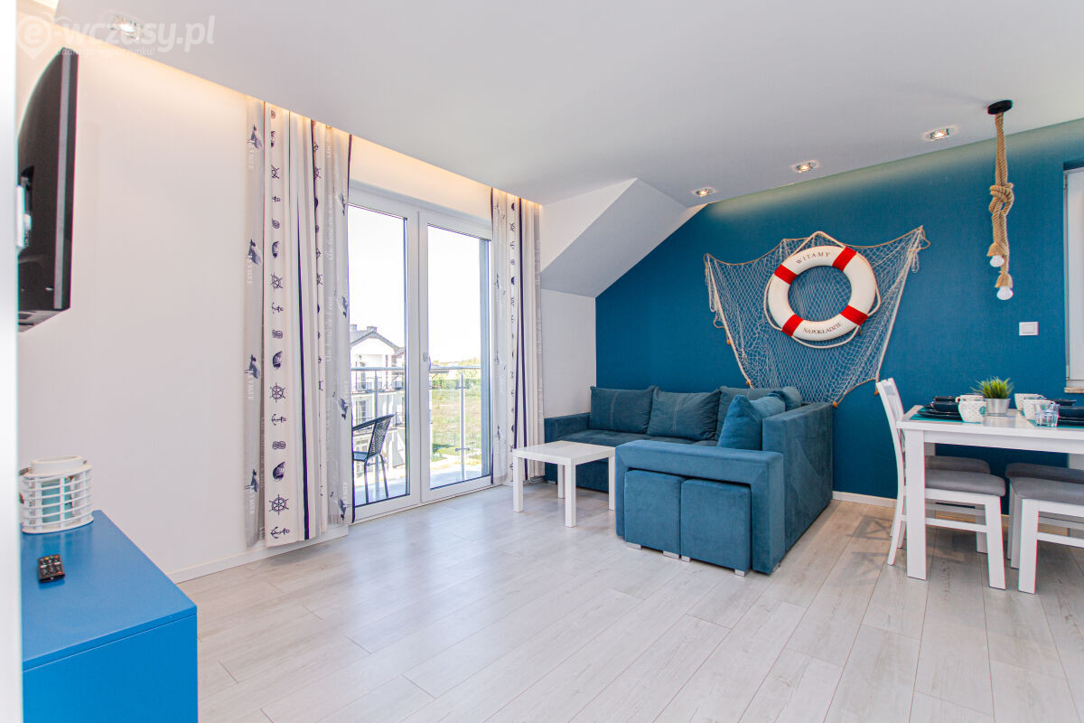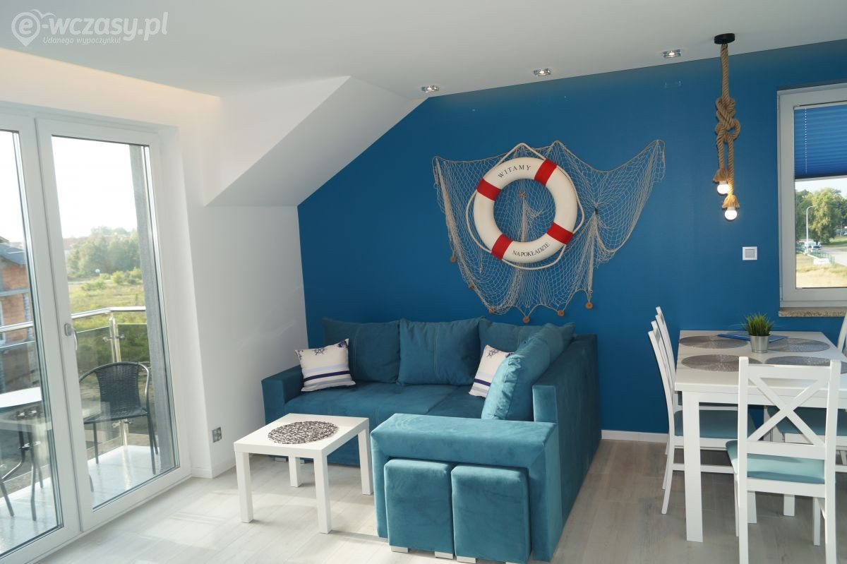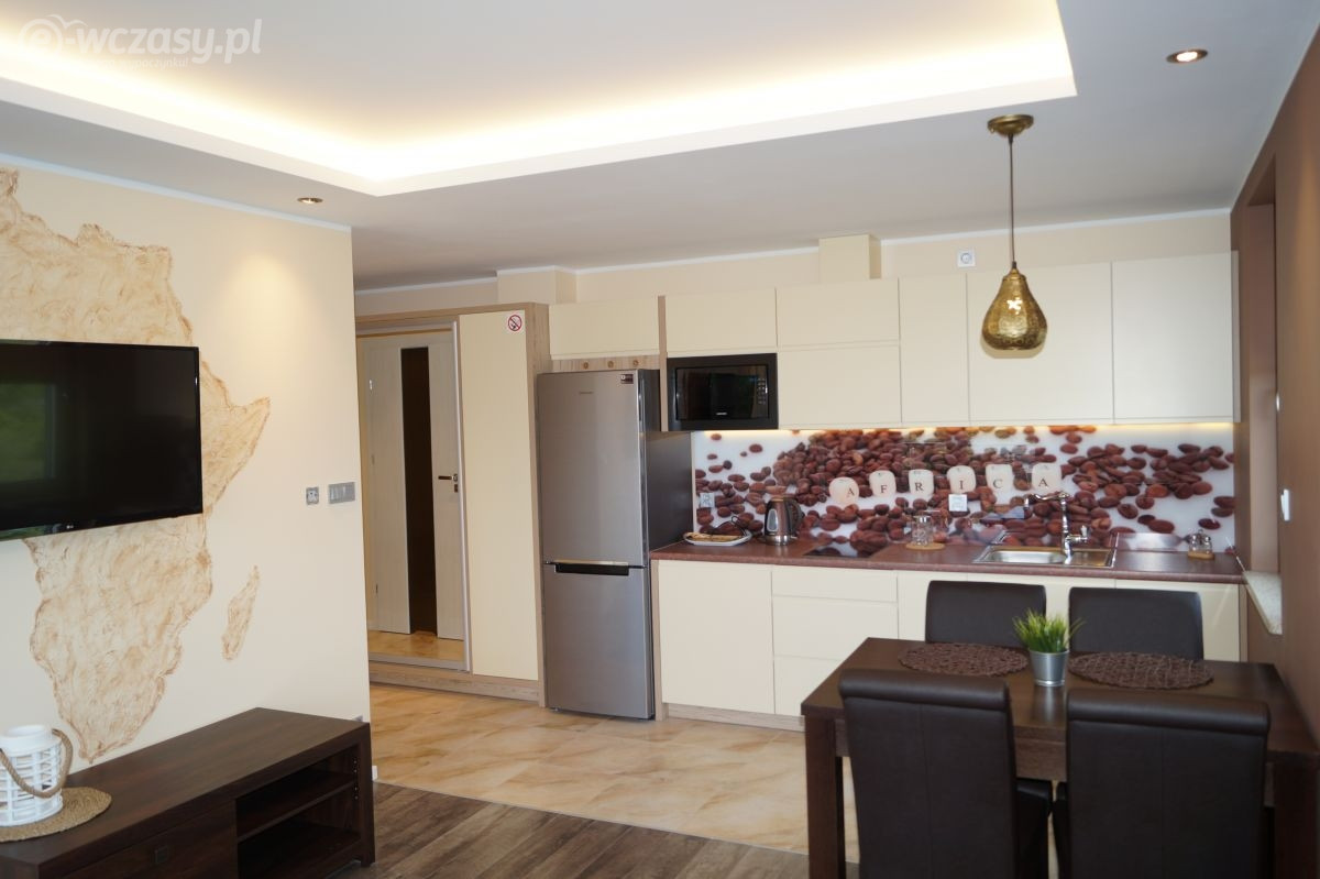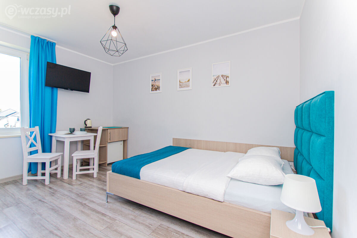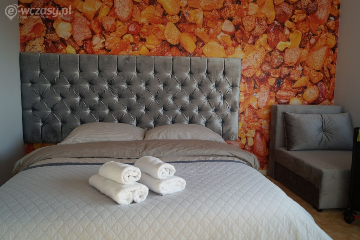 Apartamenty urządzone tematycznie ,każdy o pow. 44 m/kw , każdy,2 pokojowy - 3/5 os z kuchnią wyposażona; w lodówke z zamrażarką , czajnik, naczynia ,płyta indukcyjna , garnki , mikrofala , zmywarka + kapsułki ,w salonie rozkładany narożnik z możliwością spania, tv z smart , oddzielna sypialnia ,w którejznajduje sięłoże małżeńskie 160 cm z możliwością oddzielnego spania dla dzieci + fotel rozkładany ; łazienka : na wyposażeniu ręczniki mydło ,suszarka , deska do prasowania, suszarka na pranie , parawan , koc , leżaki na plaże , balkon -krzesła+ stolik ; w wybranych apartamentach klimatyzacja.