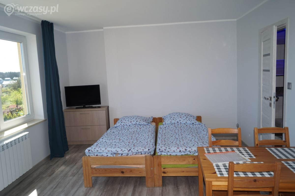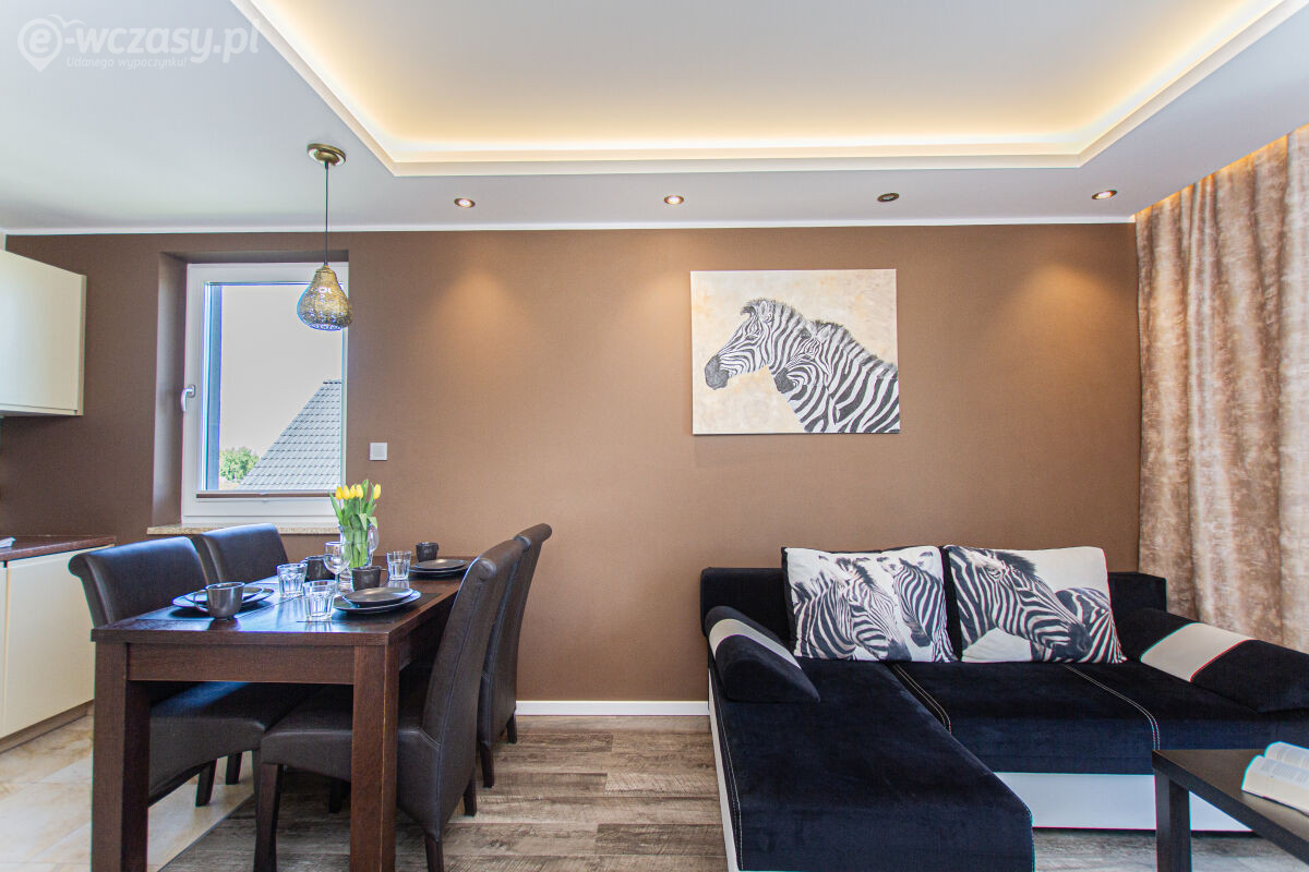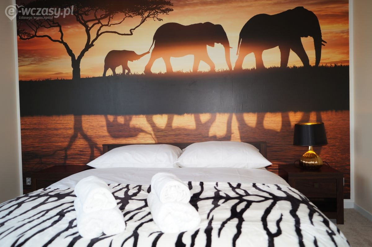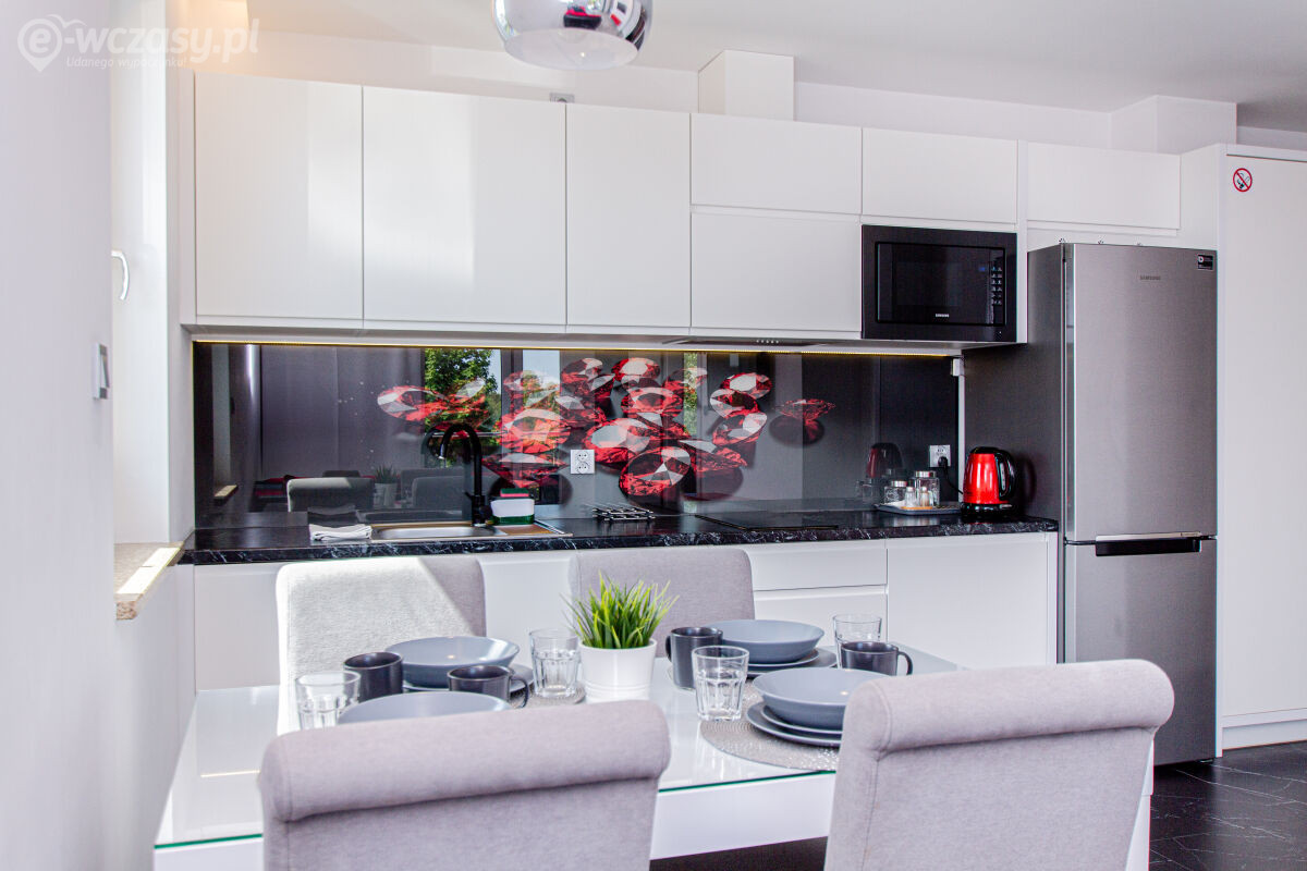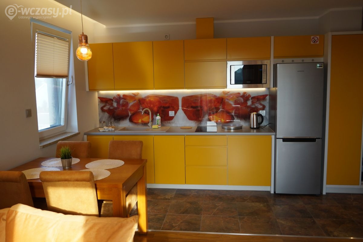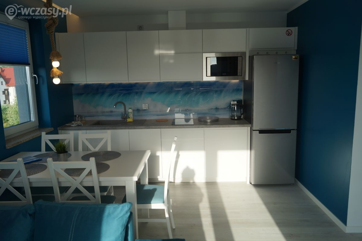 Apartamenty urządzone tematycznie ,każdy o pow. 44 m/kw , każdy,2 pokojowy - 3/5 os z kuchnią wyposażona; w lodówke z zamrażarką , czajnik, naczynia ,płyta indukcyjna , garnki , mikrofala , zmywarka + kapsułki ,w salonie rozkładany narożnik z możliwością spania, tv z smart , oddzielna sypialnia ,w którejznajduje sięłoże małżeńskie 160 cm z możliwością oddzielnego spania dla dzieci + fotel rozkładany ; łazienka : na wyposażeniu ręczniki mydło ,suszarka , deska do prasowania, suszarka na pranie , parawan , koc , leżaki na plaże , balkon -krzesła+ stolik ; w wybranych apartamentach klimatyzacja.