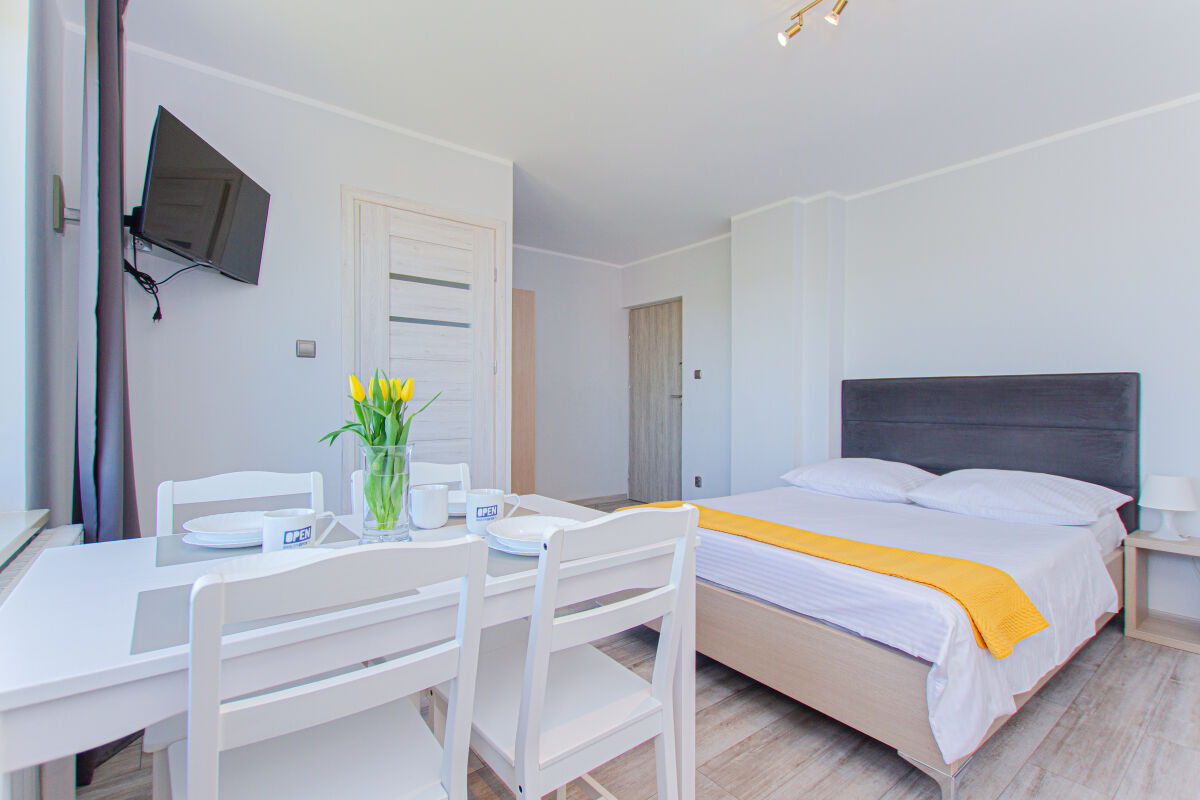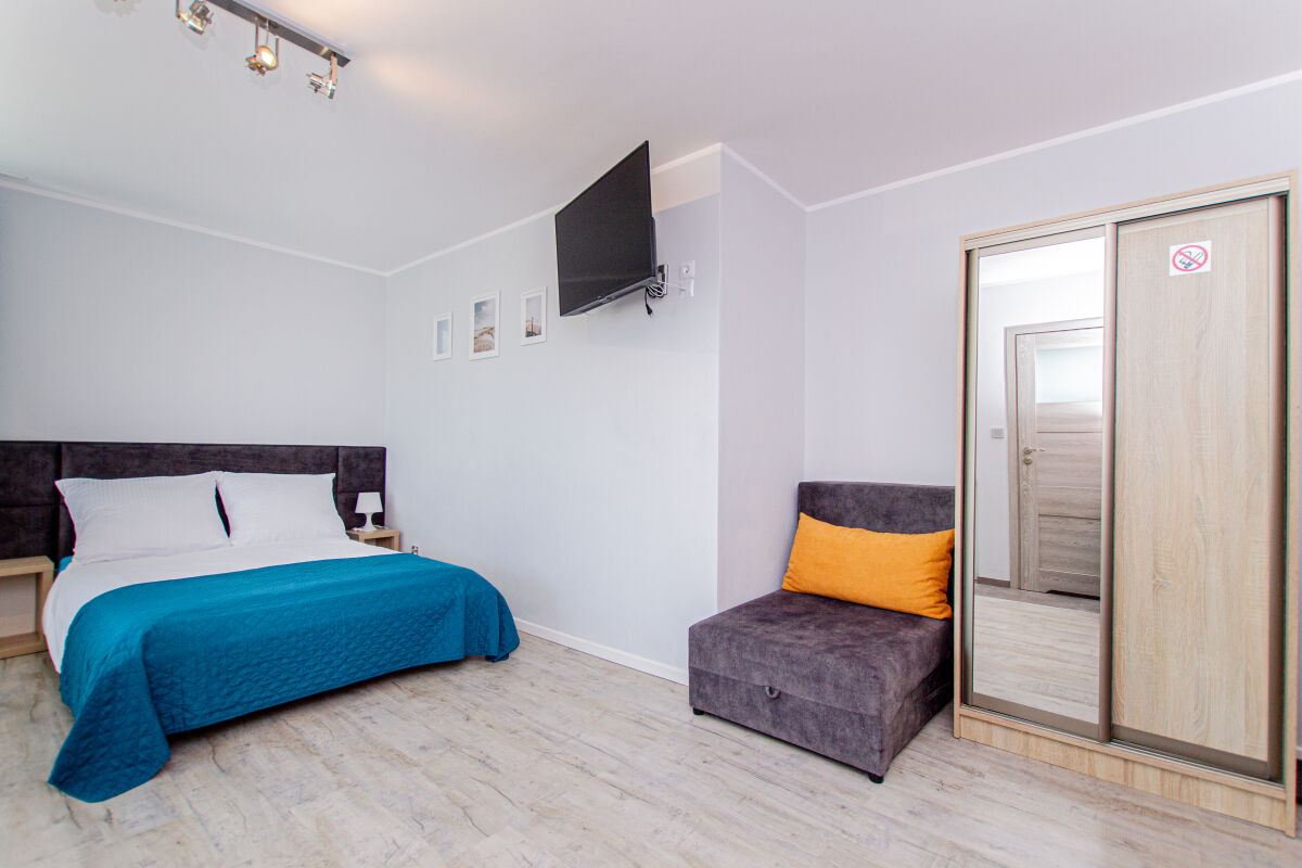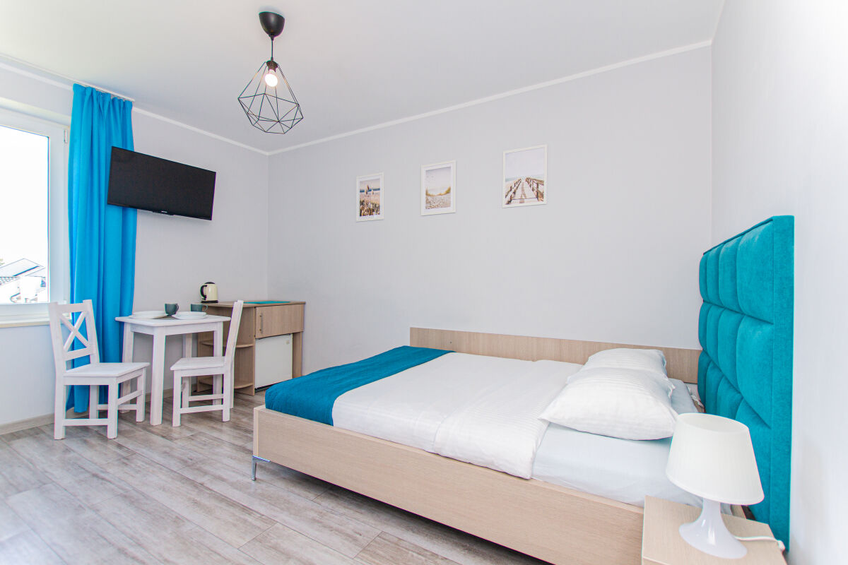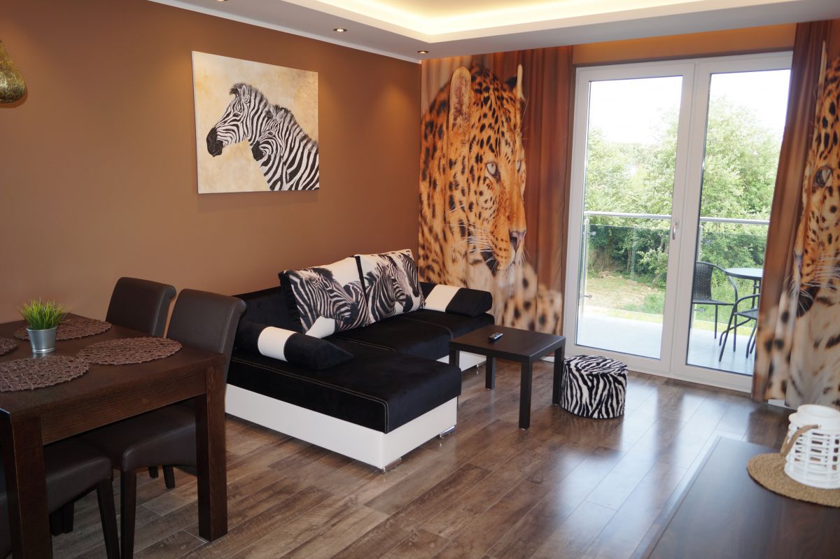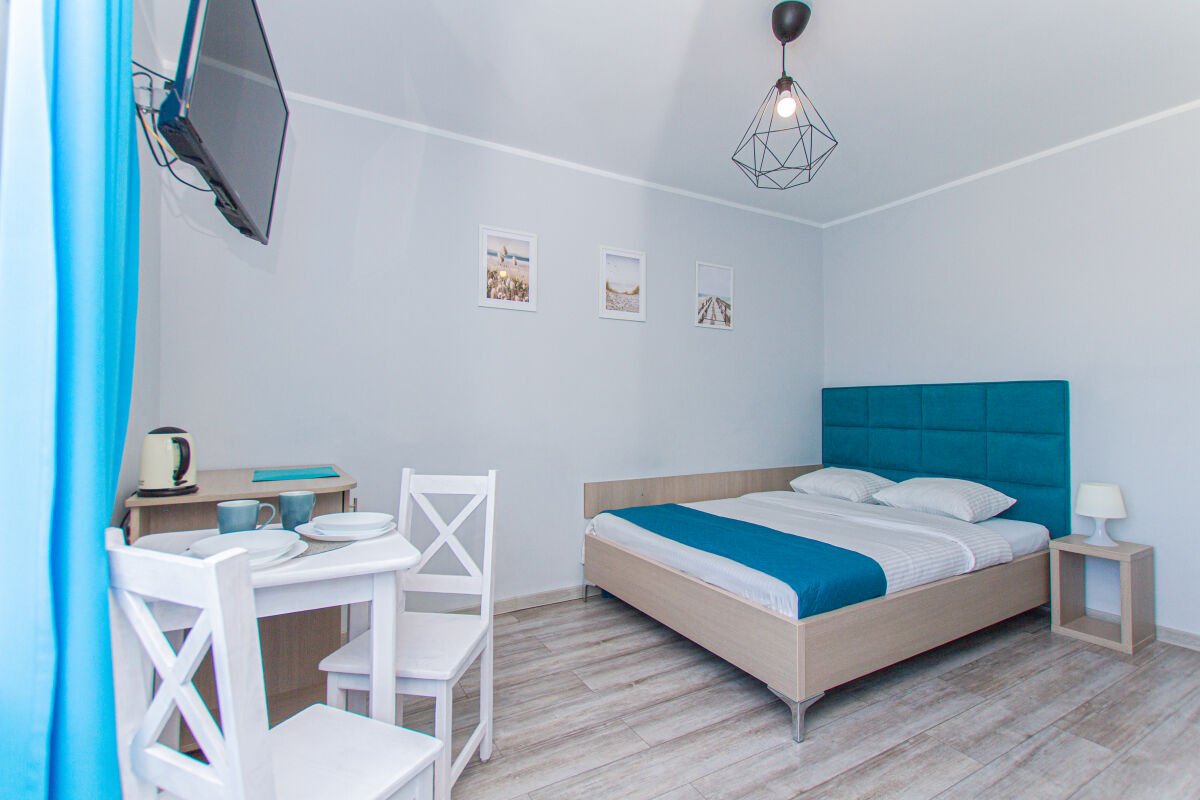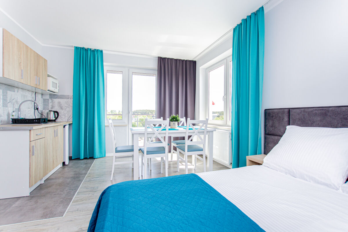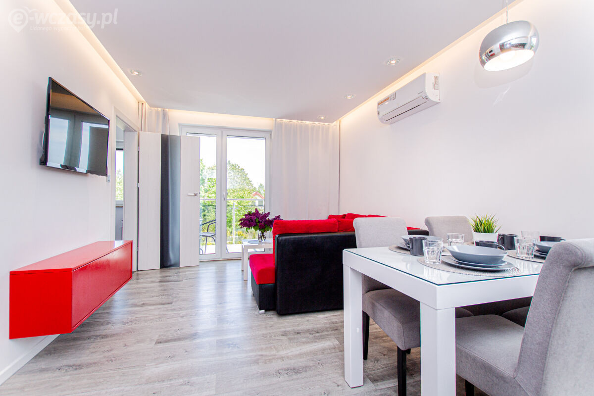 Apartamenty urządzone tematycznie ,każdy o pow. 44 m/kw , każdy,2 pokojowy - 3/5 os z kuchnią wyposażona; w lodówke z zamrażarką , czajnik, naczynia ,płyta indukcyjna , garnki , mikrofala , zmywarka + kapsułki ,w salonie rozkładany narożnik z możliwością spania, tv z smart , oddzielna sypialnia ,w którejznajduje sięłoże małżeńskie 160 cm z możliwością oddzielnego spania dla dzieci + fotel rozkładany ; łazienka : na wyposażeniu ręczniki mydło ,suszarka , deska do prasowania, suszarka na pranie , parawan , koc , leżaki na plaże , balkon -krzesła+ stolik ; w wybranych apartamentach klimatyzacja.
