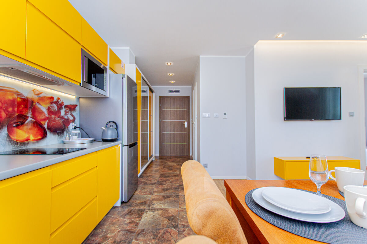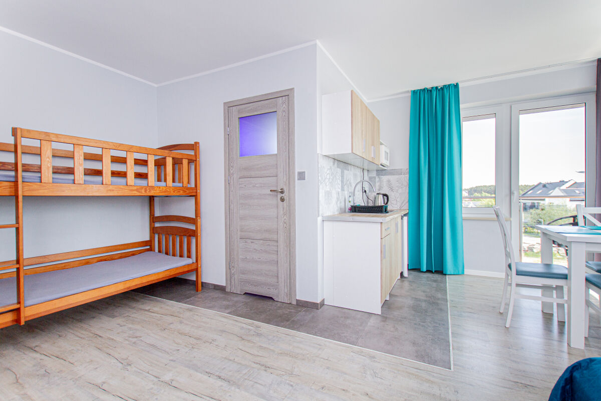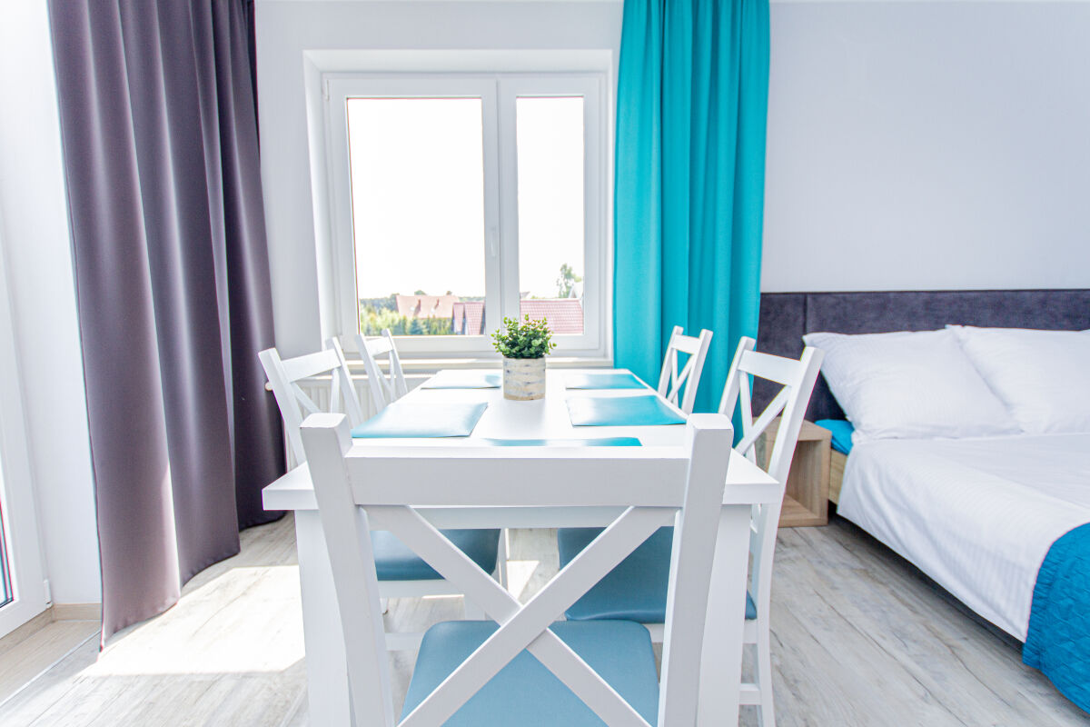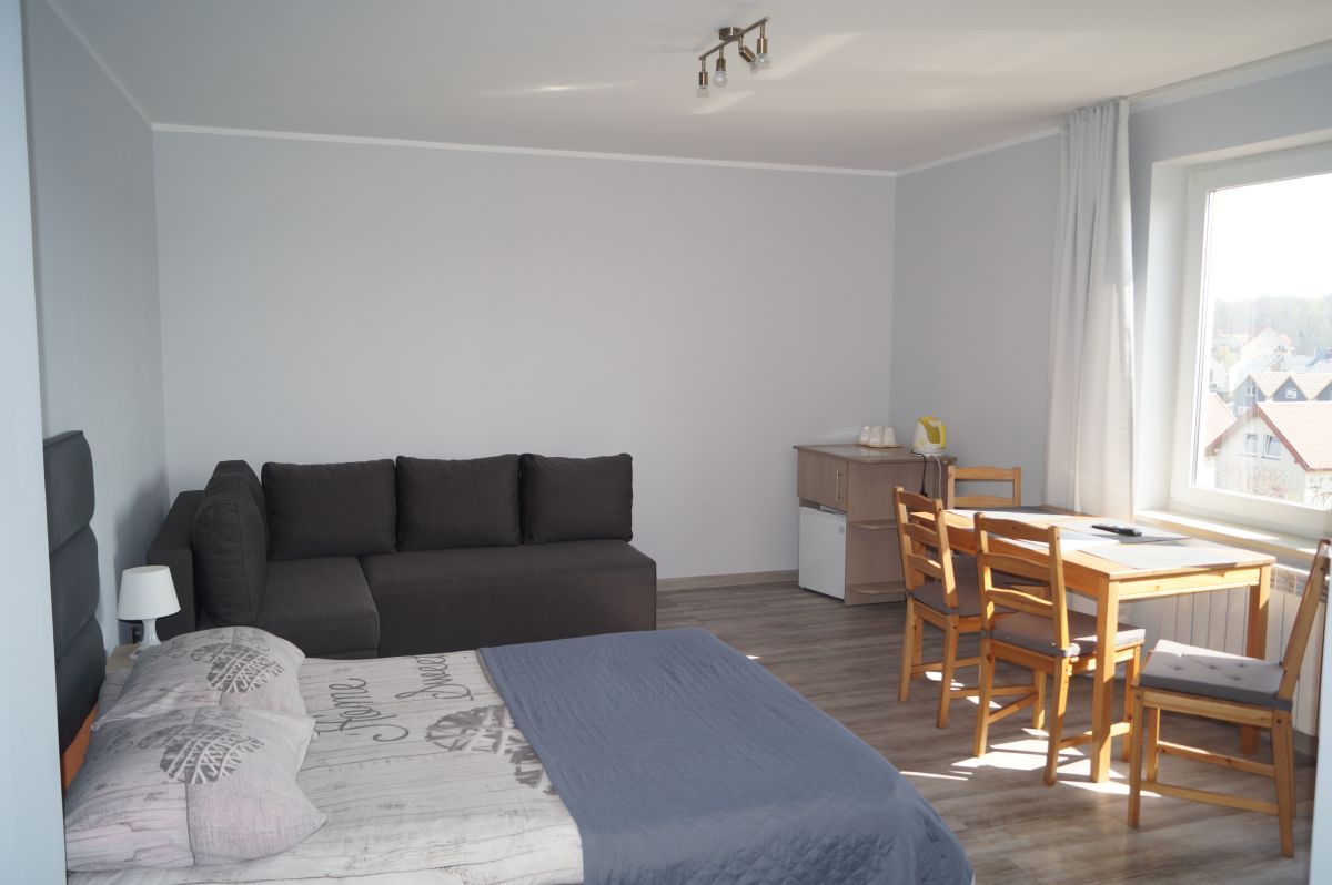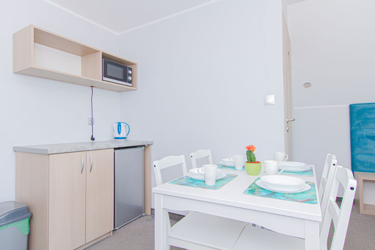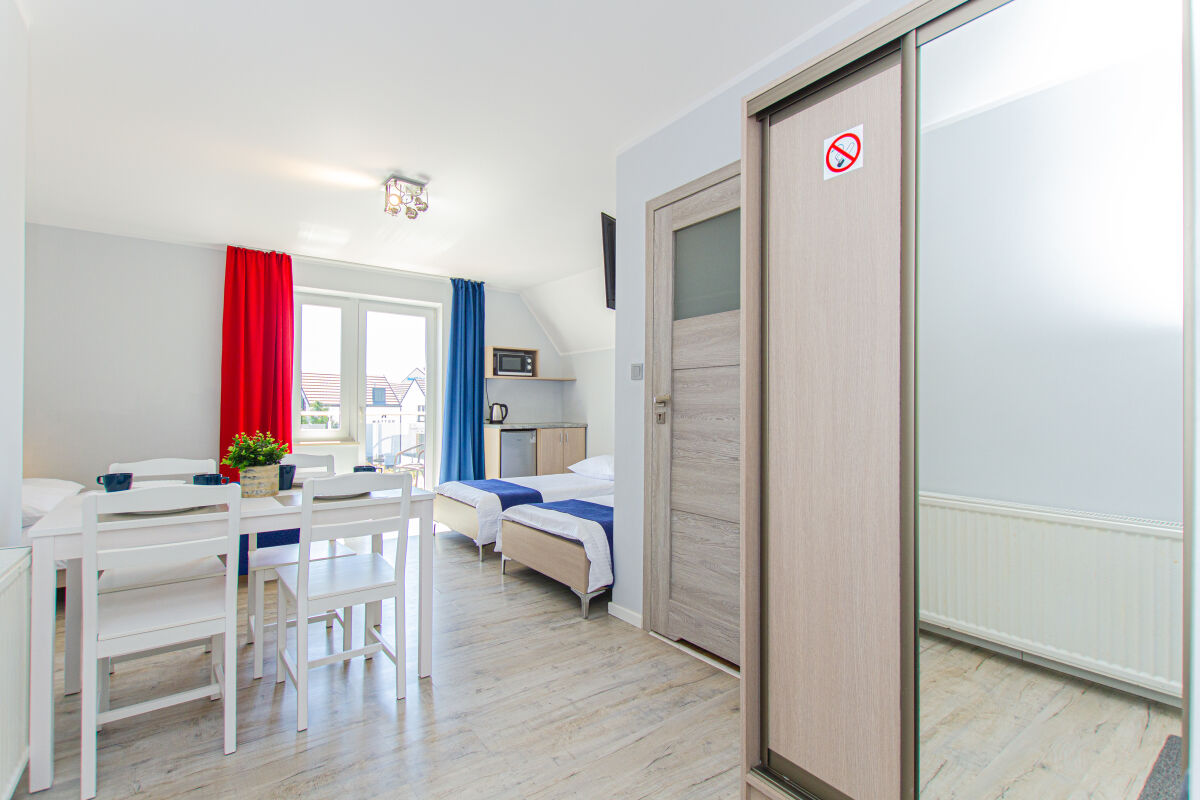 Apartamenty urządzone tematycznie ,każdy o pow. 44 m/kw , każdy,2 pokojowy - 3/5 os z kuchnią wyposażona; w lodówke z zamrażarką , czajnik, naczynia ,płyta indukcyjna , garnki , mikrofala , zmywarka + kapsułki ,w salonie rozkładany narożnik z możliwością spania, tv z smart , oddzielna sypialnia ,w którejznajduje sięłoże małżeńskie 160 cm z możliwością oddzielnego spania dla dzieci + fotel rozkładany ; łazienka : na wyposażeniu ręczniki mydło ,suszarka , deska do prasowania, suszarka na pranie , parawan , koc , leżaki na plaże , balkon -krzesła+ stolik ; w wybranych apartamentach klimatyzacja.