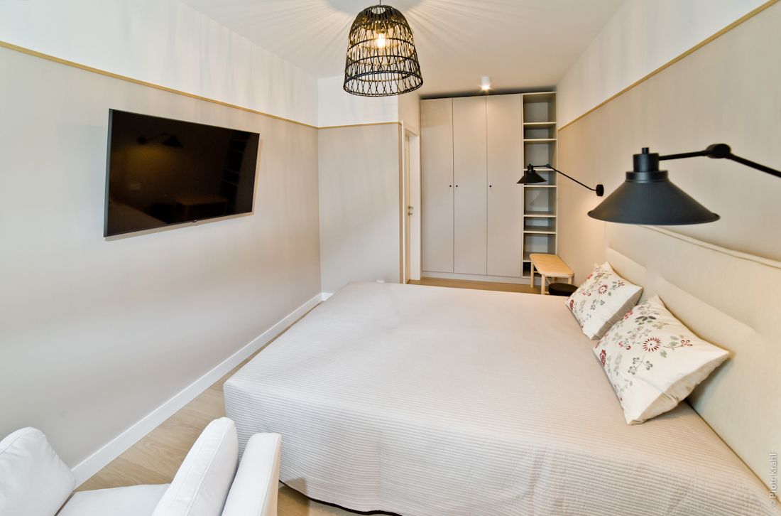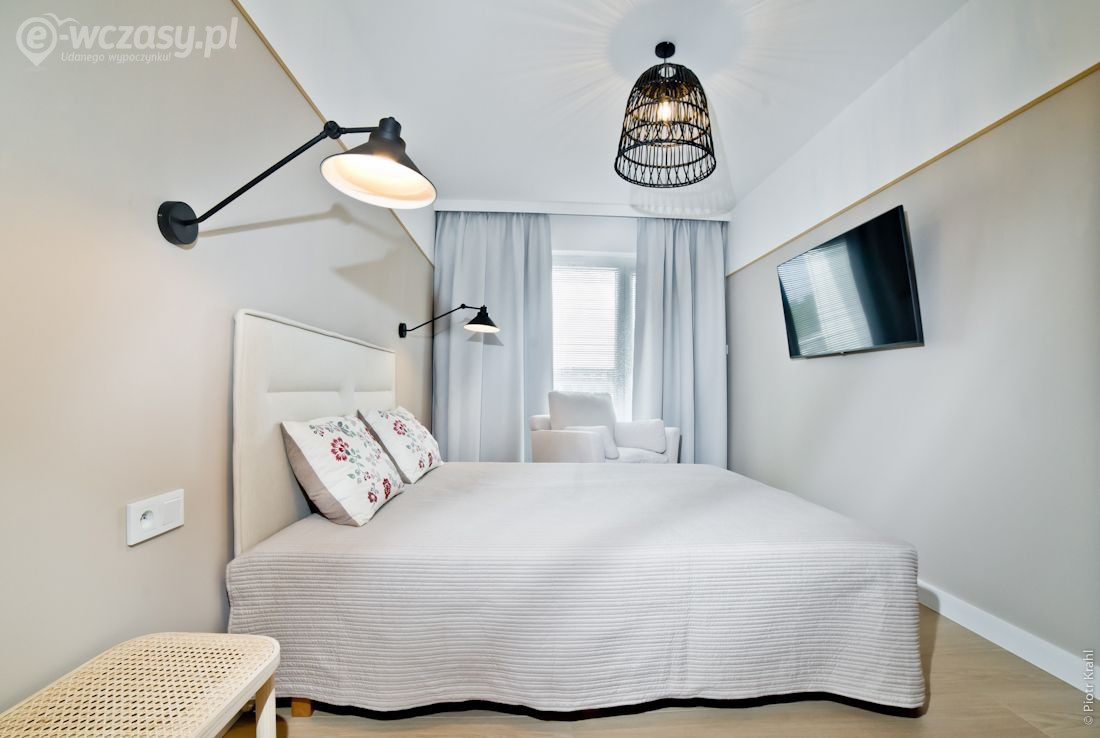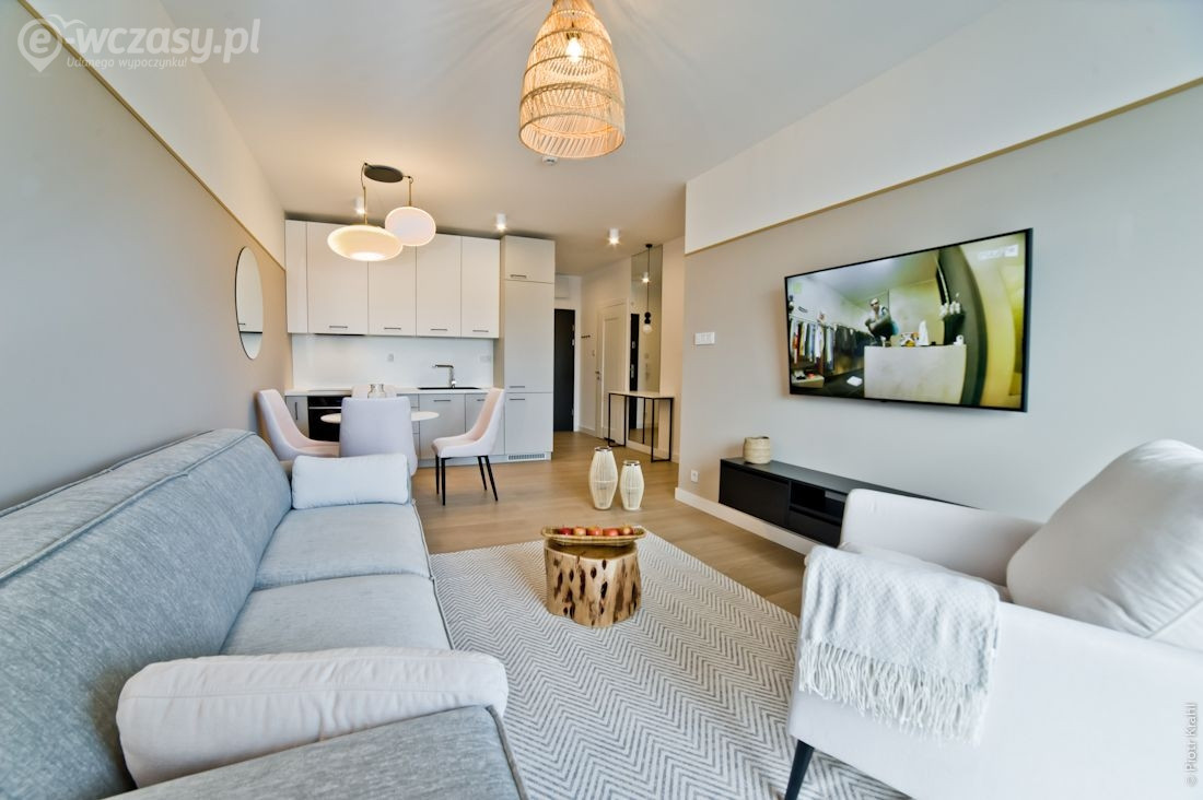 Funkcjonalnie zaprojektowany, komfortowy i nowocześnie urządzony apartament zadowoli najbardziej wymagających gości. Apartament składa się z sypialni, salonu/sypialni, kuchni,łazienki, przedpokoju z garderobą. Przestronny salon/sypialnia posiada dużą rozkładaną sofę 145x200 oraz rozkładaną sofę 80x200, w sypialni znajduje się duże łóżko małżeńskie typu Queen Size 160x200. Kuchnia w wysokim standardzie w pełni wyposażona (m.in. lodówka z zamrażarką, ekspres do kawy, zmywarka, kuchenka mikrofalowa, czajnik elektryczny, płyta indukcyjna, naczynia, sztućce, patelnia, toster, sejf, itp.) Dla małych dzieci dostępne krzesełko do karmienia, wanienka i łóżeczko turystyczne. Na balkonie znajduje się część wypoczynkowa, w której można napić się kawy i poczytać gazetę lub książkę. W łazience znajduje się kabina prysznicowa oraz pralka. (Suszarka do włosów, papier toaletowy, mydło w płynie) W garderobie niezbędny sprzęt plażowy: leżak i parawan, parasol przeciwsłoneczny, żelazko, deska do prasowania, rozkładana suszarka na ubrania, odkurzacz, itp. Lokal przeznaczony jest od 2 do 5 osób. (dorośli z dziećmi) Nie akceptujemy zwierząt w apartamencie. Ceny ustalane są indywidualnie zależnie od długości pobytu, okresu, ilości osób, proszę pisać lub dzwonić w celu ustalenia ceny ( Ceny mogą się różnić w zależności od okresu - sezonowa skala cen ) Do pobytu doliczana jest opłata jednorazowa - dezynfekcja i sprzątanie końcowe apartamentu 250 zł. Pobyty wakacyjne realizowane są od soboty do soboty, minimum 7 nocy.
