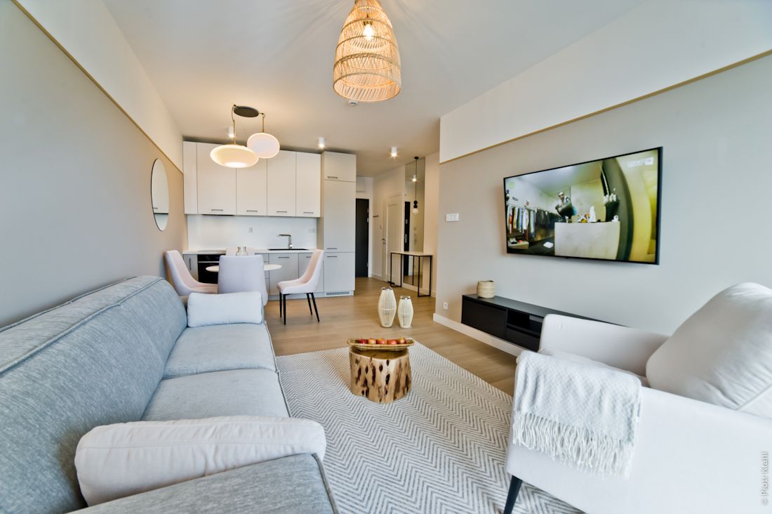 Funkcjonalnie zaprojektowany, komfortowy i nowocześnie urządzony apartament zadowoli najbardziej wymagających gości. Apartament składa się z sypialni, salonu/sypialni, kuchni,łazienki, przedpokoju z garderobą. Przestronny salon/sypialnia posiada dużą rozkładaną sofę 145x200 oraz rozkładaną sofę 80x200, w sypialni znajduje się duże łóżko małżeńskie typu Queen Size 160x200. Kuchnia w wysokim standardzie w pełni wyposażona (m.in. lodówka z zamrażarką, ekspres do kawy, zmywarka, kuchenka mikrofalowa, czajnik elektryczny, płyta indukcyjna, naczynia, sztućce, patelnia, toster, sejf, itp.) Dla małych dzieci dostępne krzesełko do karmienia, wanienka i łóżeczko turystyczne. Na balkonie znajduje się część wypoczynkowa, w której można napić się kawy i poczytać gazetę lub książkę. W łazience znajduje się kabina prysznicowa oraz pralka. (Suszarka do włosów, papier toaletowy, mydło w płynie) W garderobie niezbędny sprzęt plażowy: leżak i parawan, parasol przeciwsłoneczny, żelazko, deska do prasowania, rozkładana suszarka na ubrania, odkurzacz, itp. Lokal przeznaczony jest od 2 do 5 osób. (dorośli z dziećmi) Nie akceptujemy zwierząt w apartamencie. Ceny ustalane są indywidualnie zależnie od długości pobytu, okresu, ilości osób, proszę pisać lub dzwonić w celu ustalenia ceny ( Ceny mogą się różnić w zależności od okresu - sezonowa skala cen ) Do pobytu doliczana jest opłata jednorazowa - dezynfekcja i sprzątanie końcowe apartamentu 250 zł. Pobyty wakacyjne realizowane są od soboty do soboty, minimum 7 nocy.
