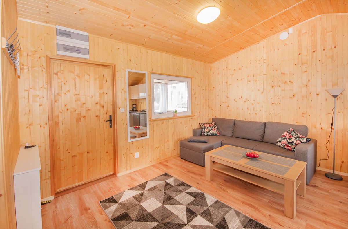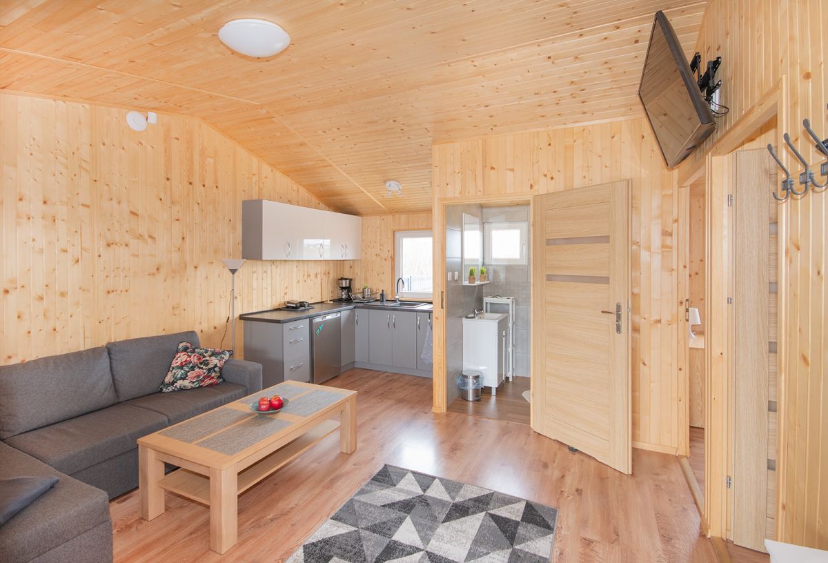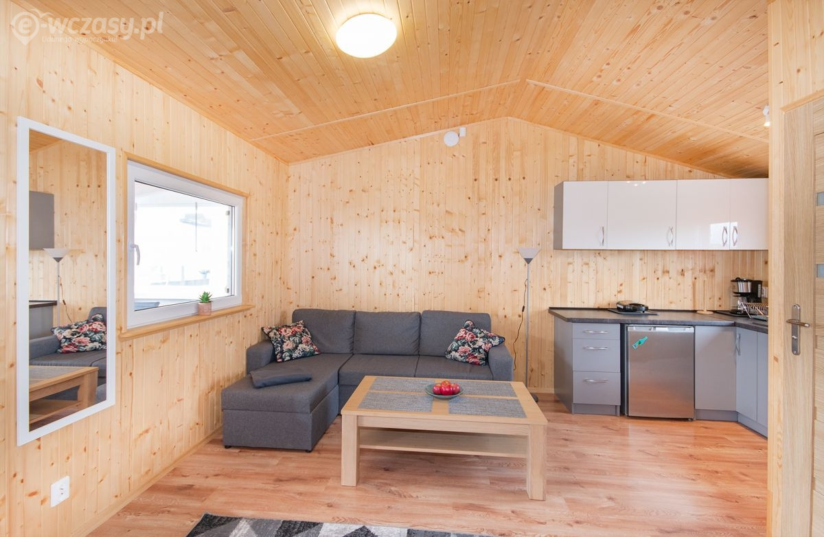 Salon: klimatyzacja,kanapa narożna z funkcją spania dla 2 osób (zapewniamy pościel), smart TV 43 cale, stolik kawowy, 2 krzesła,szafka na buty,