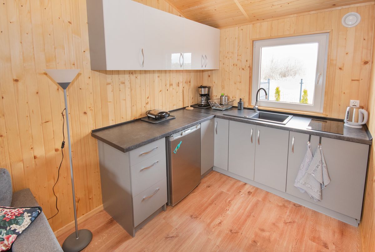 Aneks kuchenny: lodówka, płyta ceramiczna, komplet garnków, naczynia, sztućce, czajnik elektryczny