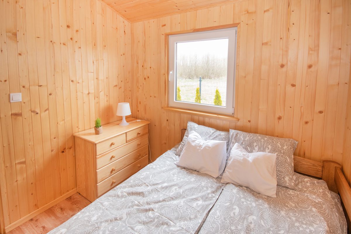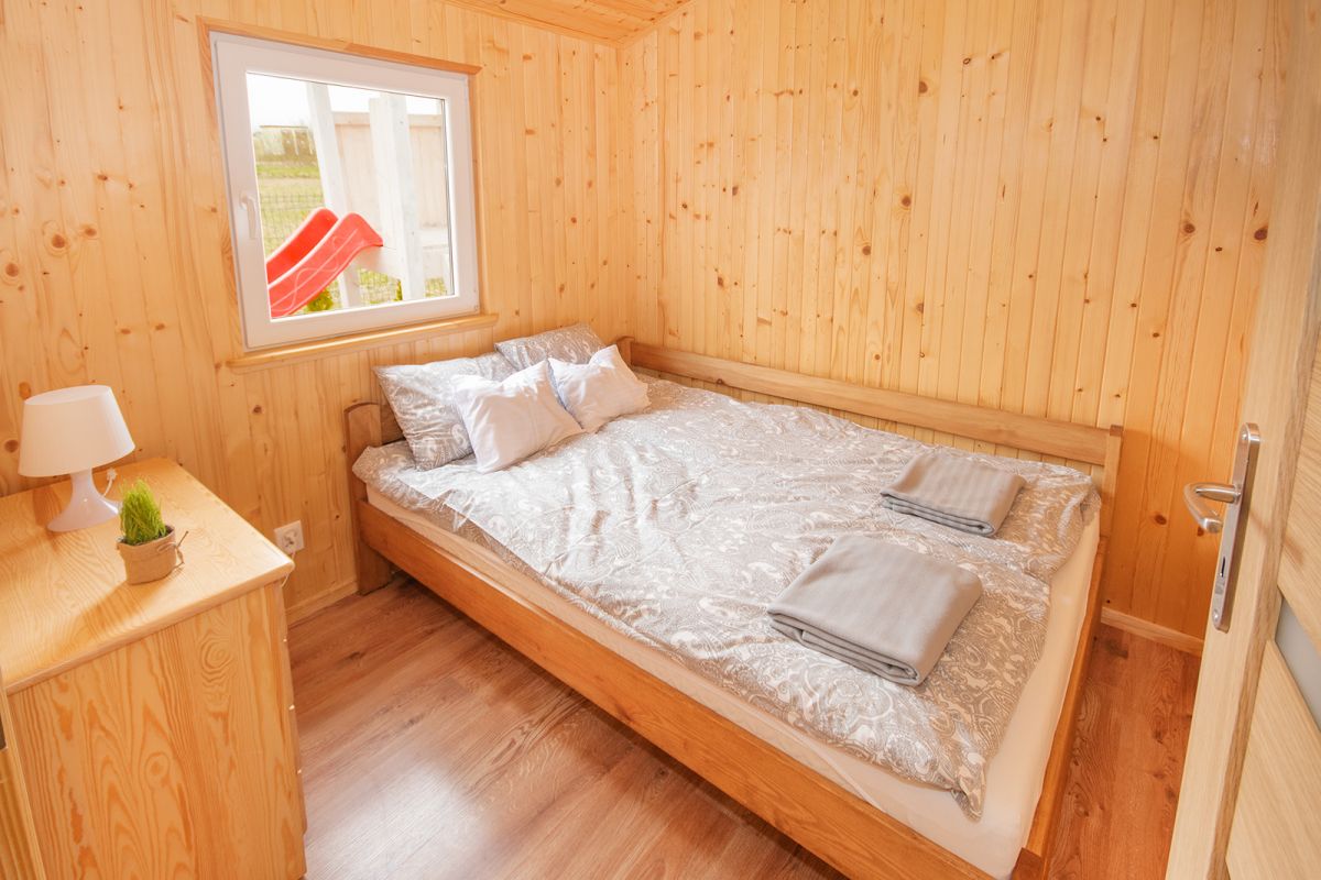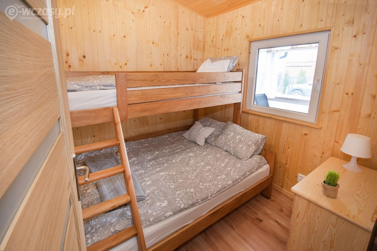 Sypialnie: – 1) łóżko małżeńskie, 2) łóżko piętrowe: 1-osobowe (u góry) + 2-osobowe (na dole), komoda, lampka nocna w obu sypialniach.