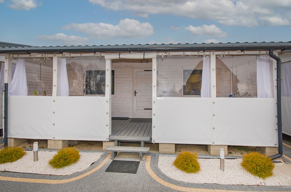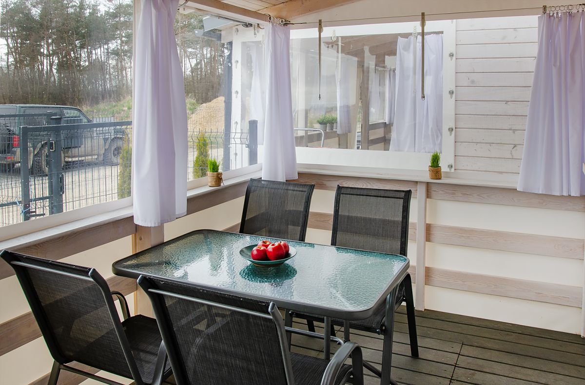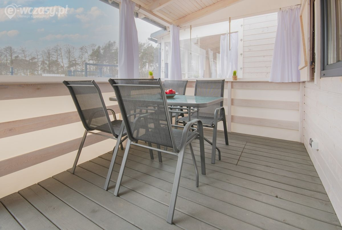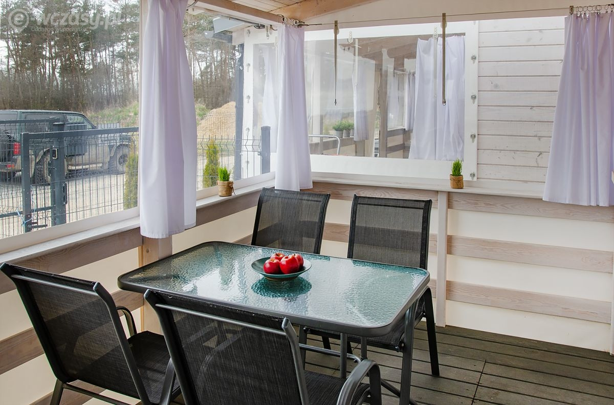 Taras 14 m2, zadaszony, wyposażony w plandeki chroniace przed wiatrem i deszczem, komplet mebli (stół i 4 krzesła)+2krzesła, sprzęt plażowy( parawan , leżak)