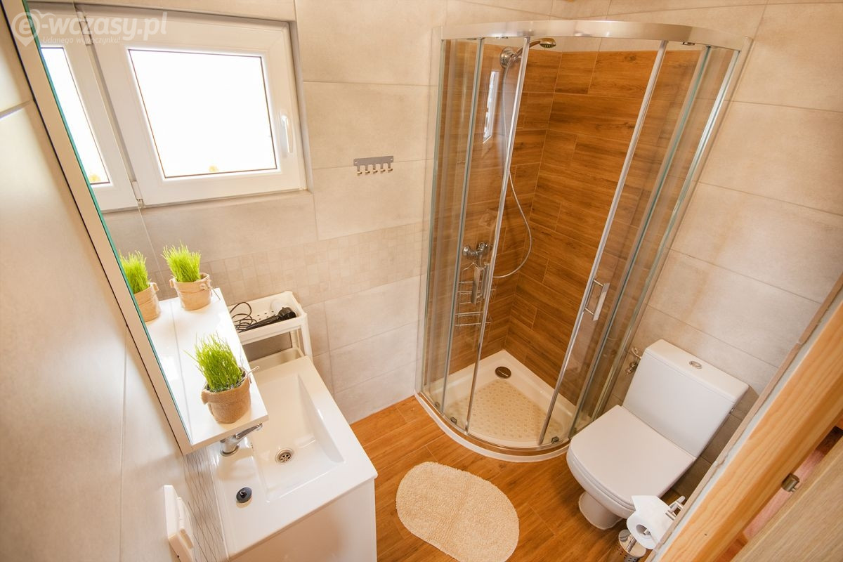 Łazienka: prysznic, umywalka, wc, szafka, suszarka do włosów.