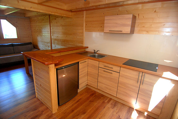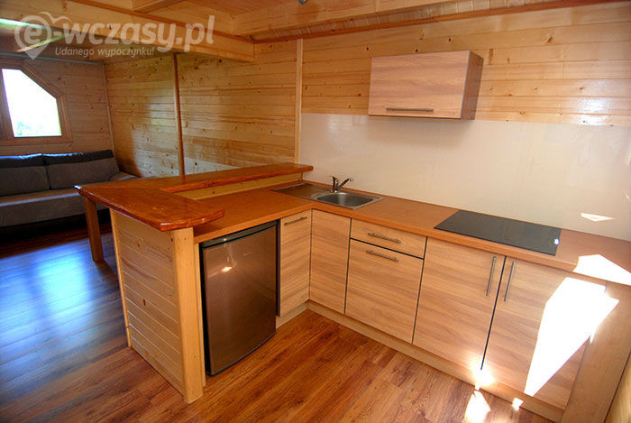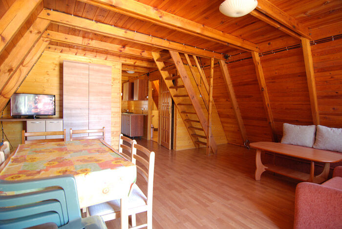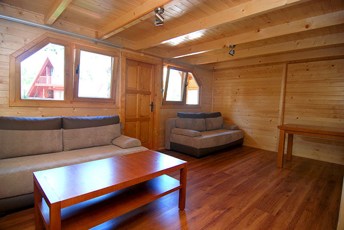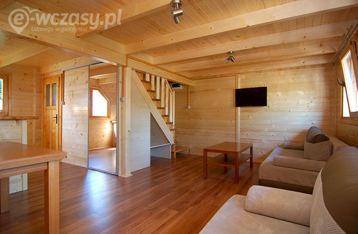 Kondygnacja dolna: pokój dzienny z dwoma kanapami, ława,stół z 8 krzesłami, szafa ,TV 32", aneks kuchenny – chłodziarka, zlewozmywak, płyta indukcyjna 4 palnikowa , szafki na naczynia z kpl naczyń dla 6 osób , garnki , łazienka (kabina natryskowa, wc, umywalka .