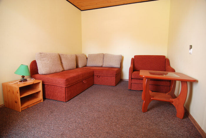 - pokoju w którym znajduje się kanapa rozkładana ( 1,4 m ) + sofa rozkładana ( 1,4 m), szafa typu komandor z dużym lustrem , ława , szafka , TV led 32 cala