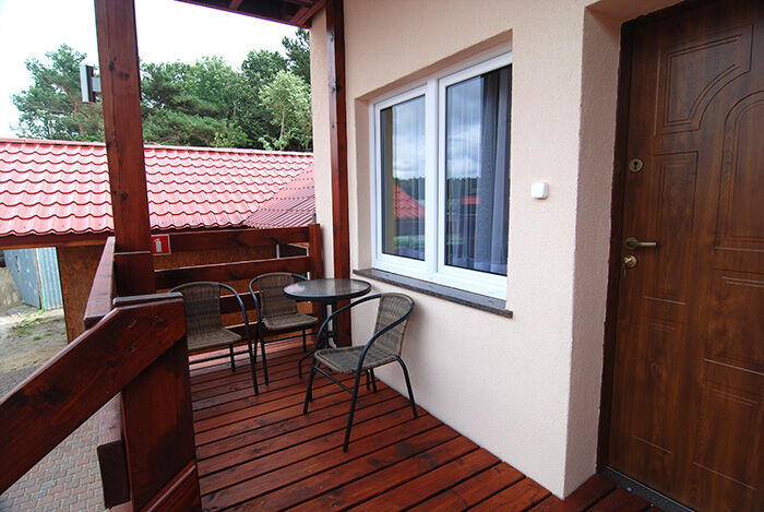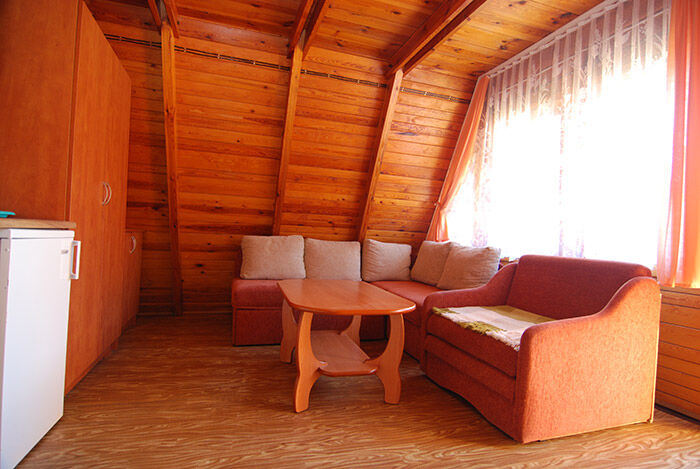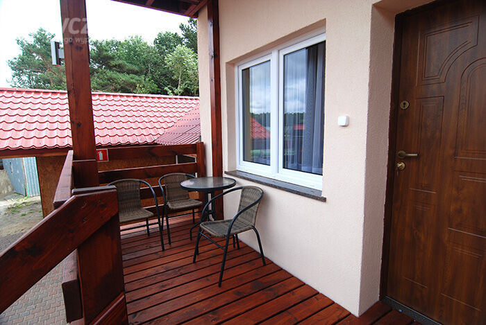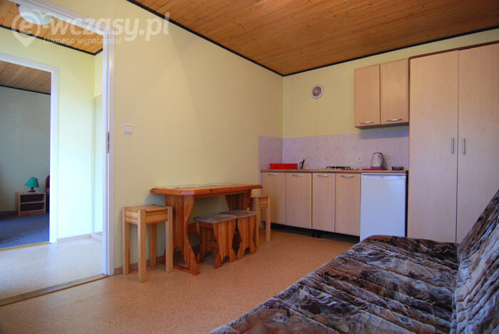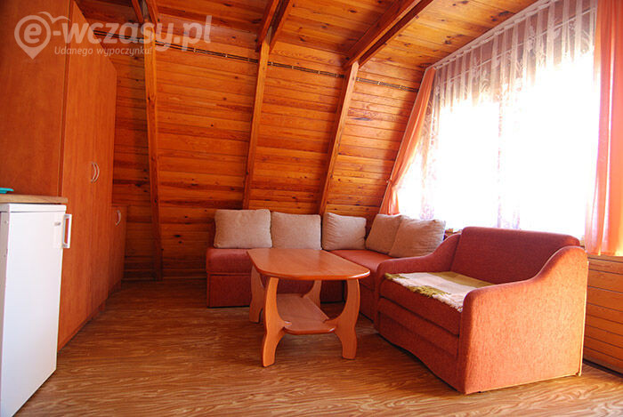 1. Pokój na parterze posiada: 2 spania (narożnik + fotel rozkładany), TV, szafę dwudrzwiową, ławę, kącik kuchenny (szafki, lodówka, kuchenkę gazową-dwupalnikową , zlewozmywak jednokomorowy z ociekarką, czajnik elektryczny, kpl naczyń dla 4osób ( na wyposażeniu nie ma garnków). Na parterze znajduję się także łazienka ( kabina natryskowa , wc, umywalka ) 2. Pokój na piętrze z balkonem ( dwa spania, szafki nocne) - wejście do pokoju schodami z pokoju na parterze . Ponadto na wyposażeniu każdego wejścia jest stół ogrodowy z kpl krzeseł, parawan, dwa leżaki.