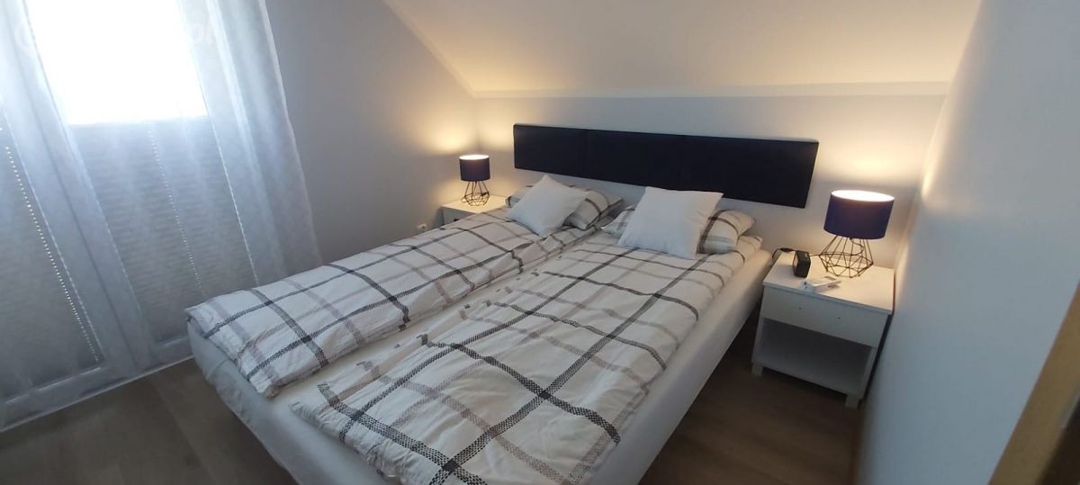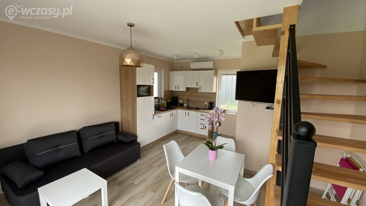 Nasze domki są w pełni umeblowane i wyposażone we wszystkie niezbędne rzeczy. Na piętrze znajdują się dwie sypialnie. Jedna z dużym łóżkiem 160 cm x 200 cm, stolikami nocnymi z lampkami, komodą z lustrem oraz z szafą. Druga sypialnia to dwa oddzielne łóżka ze stolikami nocnymi oraz lampkami. Na parterze znajduje się duża rozkładana kanapa, która w dzień służy jako wypoczynek, rozkładany stół z sześcioma krzesłami, telewizor 43 cale (z różnymi aplikacjami, np. YouTube), telewizja NC+. Kuchnia posiada dużą lodówkę, zmywarkę, toster, czajnik bezprzewodowy, ekspres do kawy, garnki, talerze, sztućce, szklanki, kubki i kieliszki do wódki, piwa i wina. Łazienka to duży prysznica 90 cm x 90 cm z deszczownicą i suszarka do włosów. Wszystkie pomieszczenia są klimatyzowane i ogrzewane (góra i dół). Na terenie całego obiektu jest Wi-Fi, parking monitorowany i oświetlony. Do każdego domku przynależy duży taras z meblami rattanowymi dla sześciu osób i grillem. Na terenie jest duży plac zabaw dla dzieci z dużym wojskowym samochodem na sprężynach.