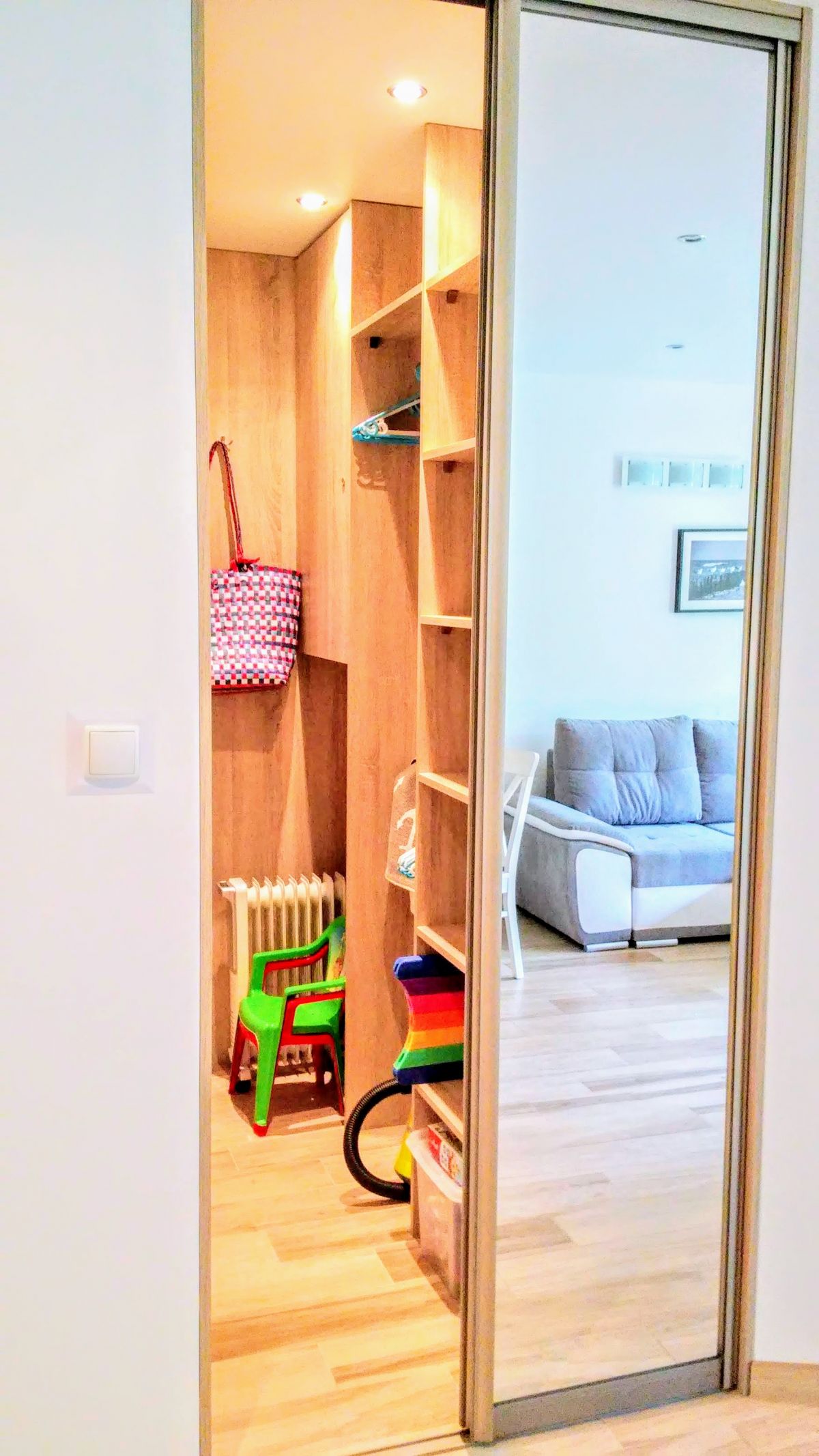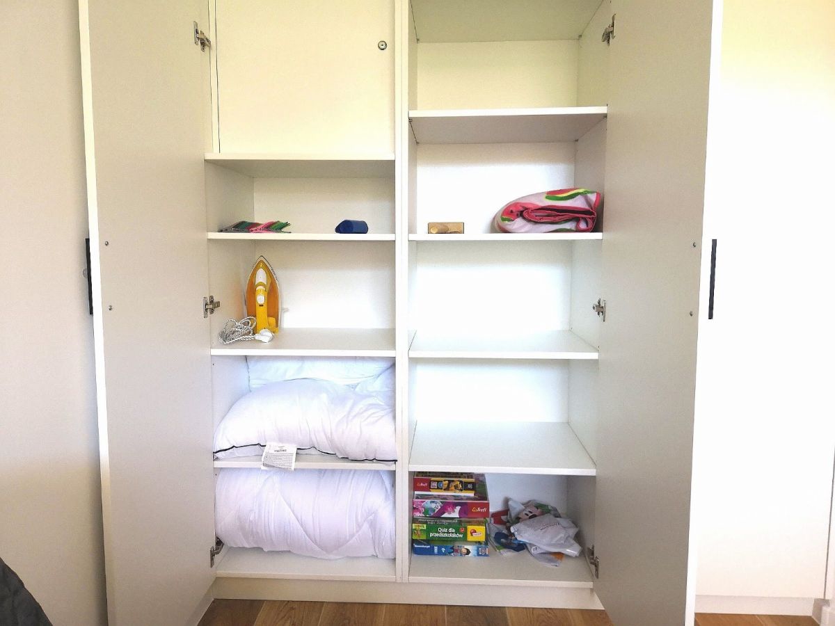 - garderoba - szafki do przechowywania, wieszaki, odkurzacz, deska do prasowania, żelazko, suszarka, łóżeczko turystyczne, leżaki plażowe (4), parawan plażowy