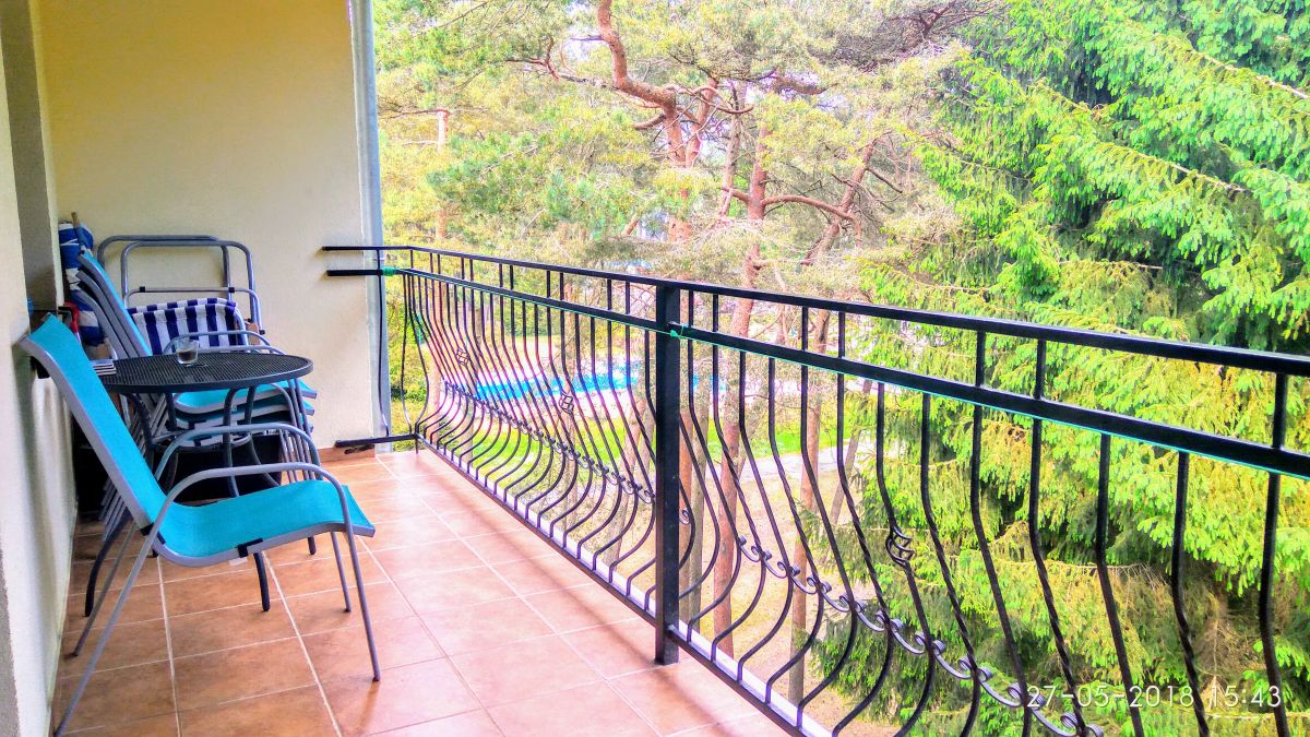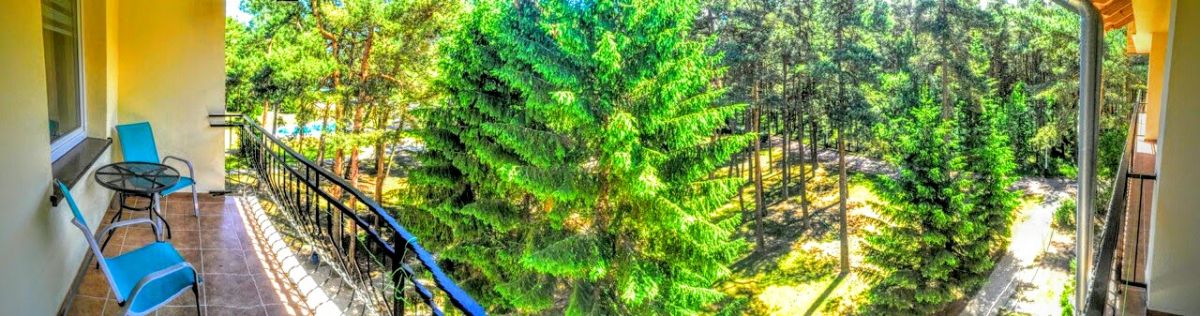 - balkon na stronę zachodnią z widokiem na basen i las sosnowy. Na balkonie stół + cztery wygodne krzesła.