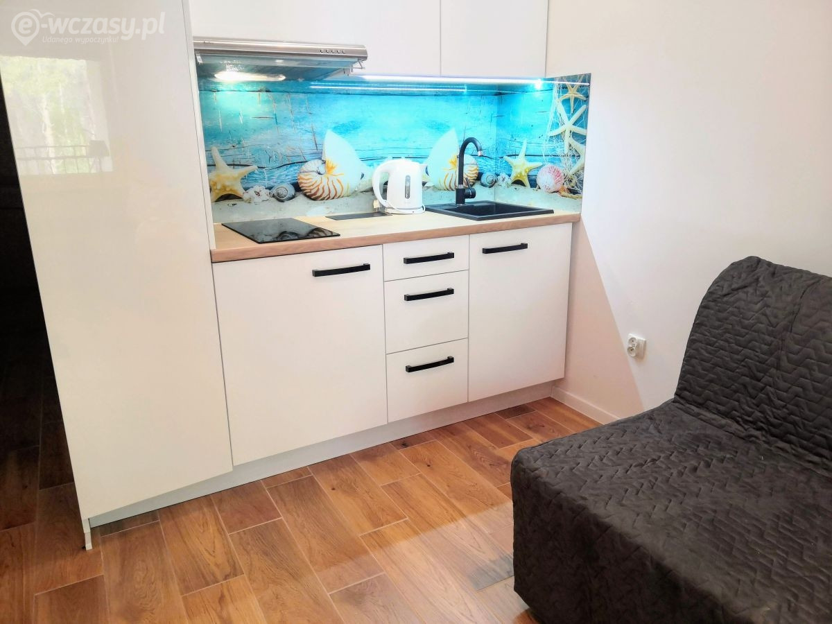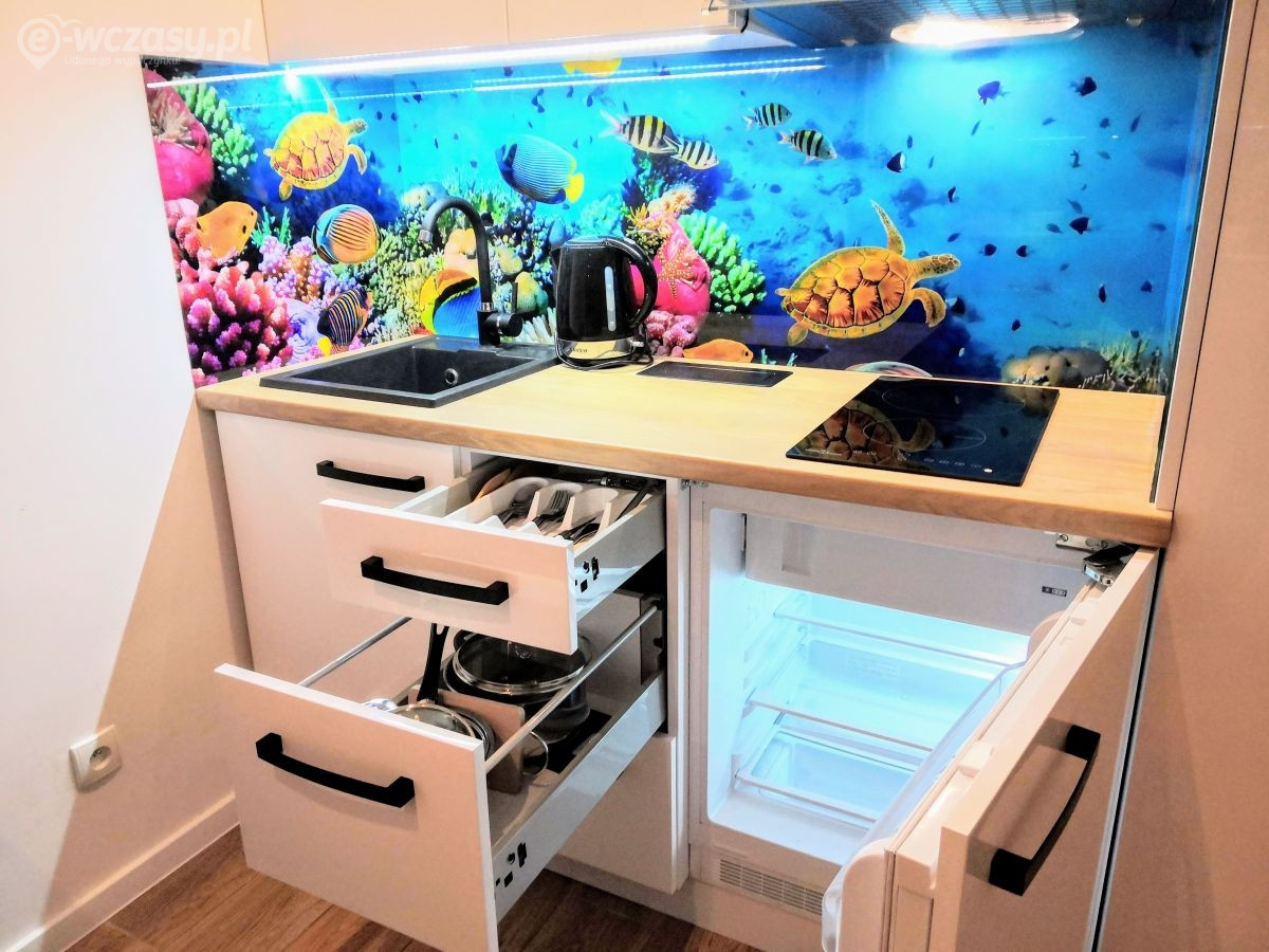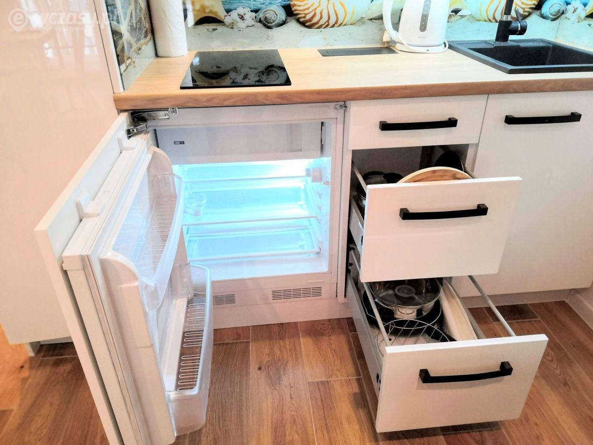 - kuchnia - aneks kuchennym w pełni wyposażony: kuchenka mikrofalowa, zmywarka, ekspres do kawy, płyta grzewcza, lodówka, garnki, patelnie, sztućce, talerze, pełna chemia do kuchni i do łazienki.