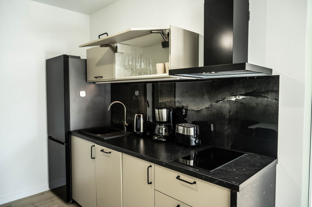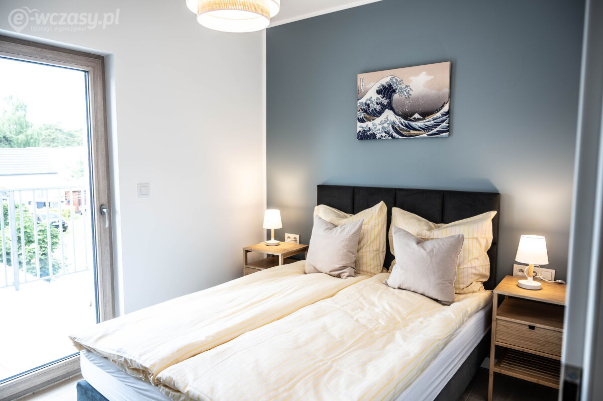Każdy z apartamentów posiada 2 osobne sypialnie: jedną typu master oraz drugą typu twin, przestronny salon z rozkładaną sofą, dużą łazienkę oraz aneks kuchenny wraz ze stołem jadalnianym. Aneks kuchenny został kompleksowo wyposażony w płytę indukcyjną, dużą lodówkę z zamrażarką, czajnik, ekspres przelewowy, toster, zmywarkę, pełen zestaw sztućców, naczyń i przyborów kuchennych. Na wyposażeniu znajdują się także pościel, ręczniki, zestaw kosmetyków hotelowych, oraz koc na plażę i parawan.