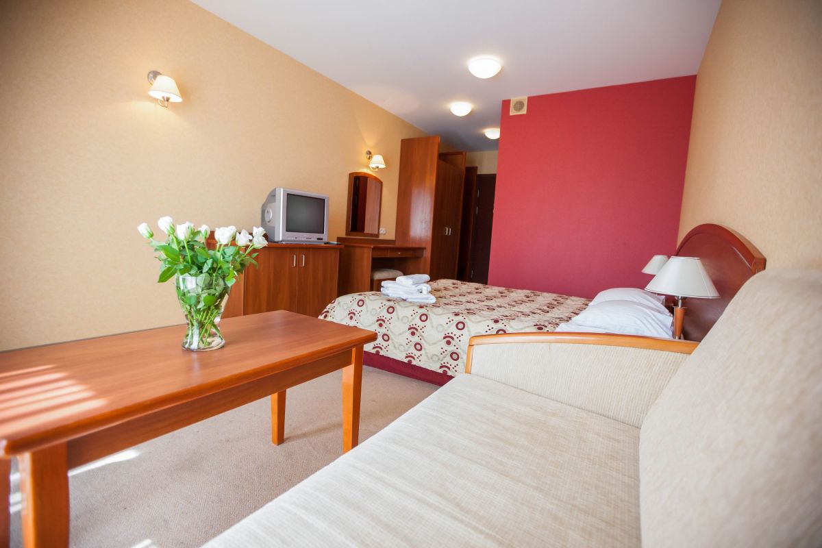 - W przypadku braku wolnych miejsc w pokojach 2-os., jest możliwość zamiany pokoju na pokój 3-os. W pokoju do spania jest łoże małżeńskie + sofa do rozkładania lub ?.wygodnego siedzenia. Łączny koszt dopłaty do pokoju za 2 osoby = 40 zł/dzień;