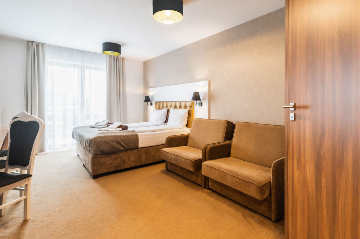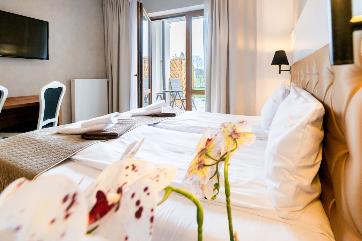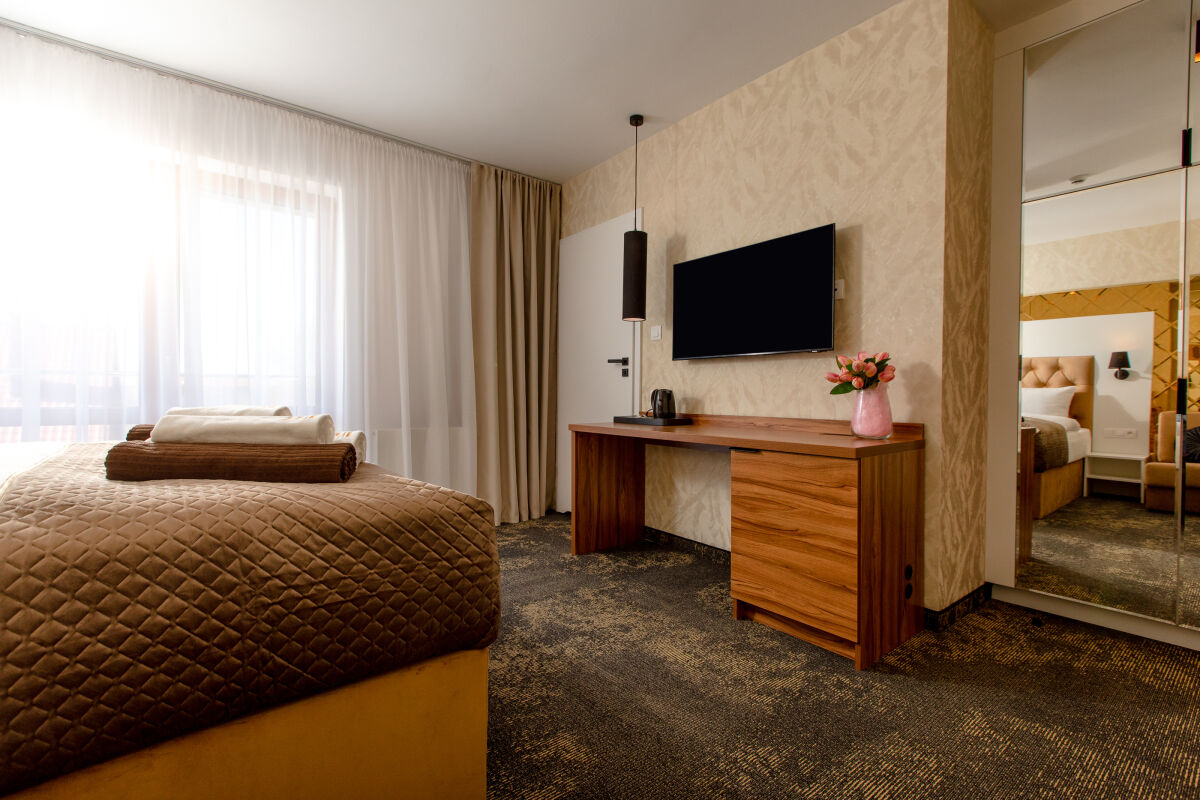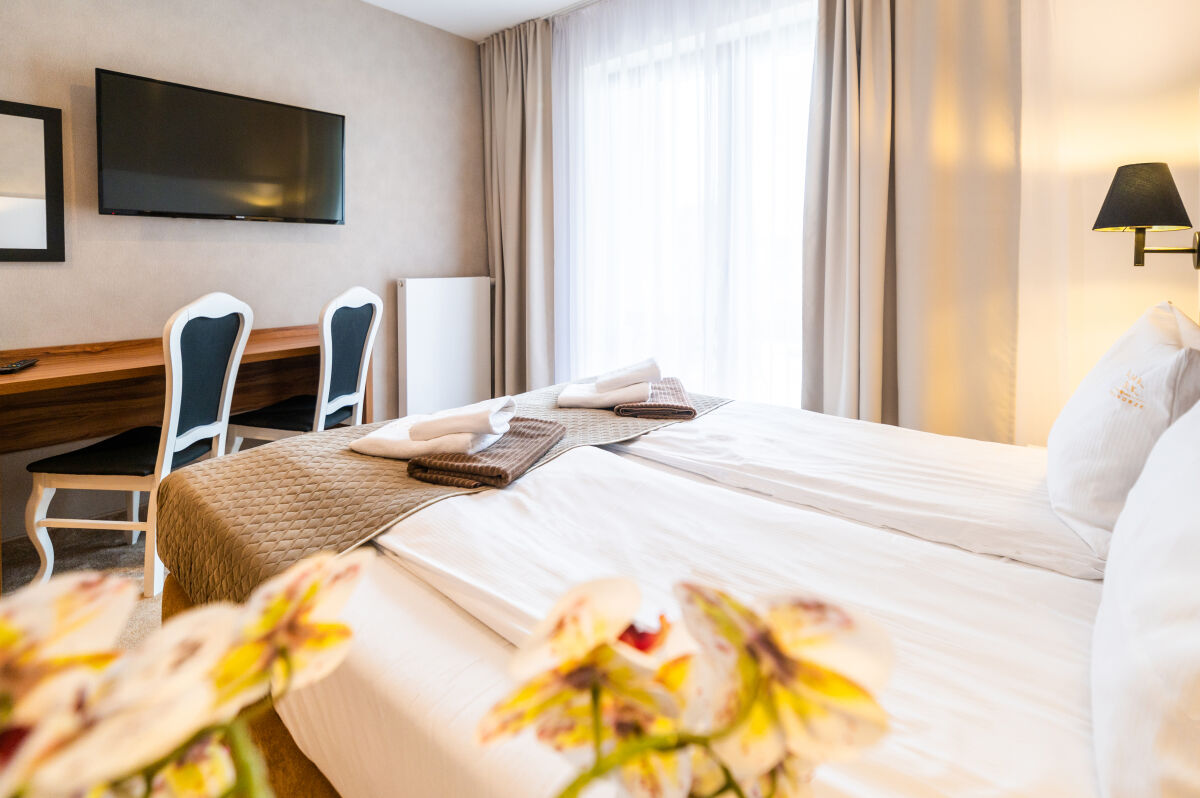 Gwarantujemy bogate wyposażenie pokoi – zestaw ręczników łazienkowych i basenowych, zestaw kosmetyków hotelowych, profesjonalna suszarka do włosów, chłodziarka, czajnik z zestawem cafe&tea.