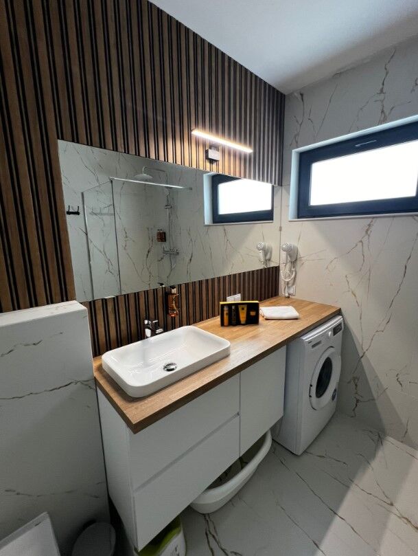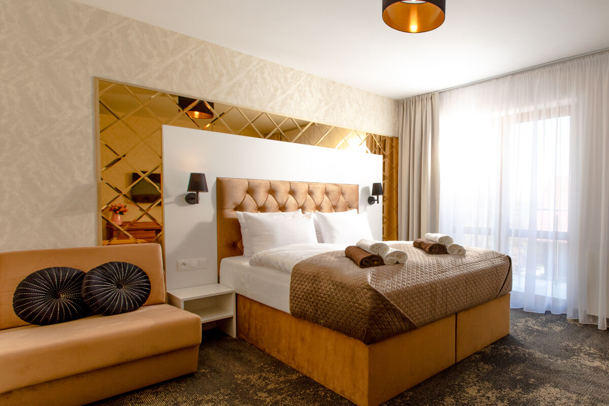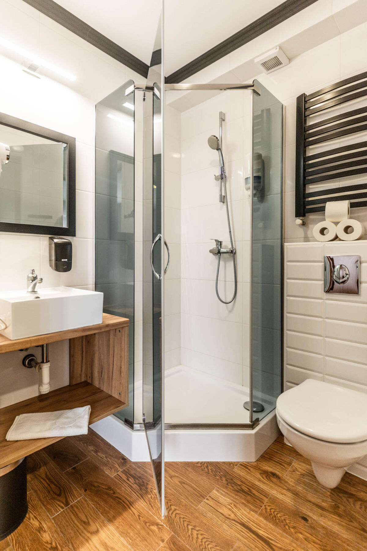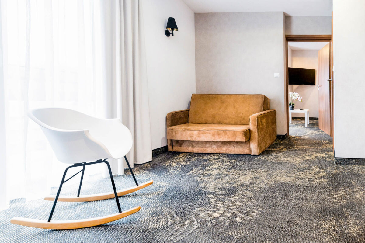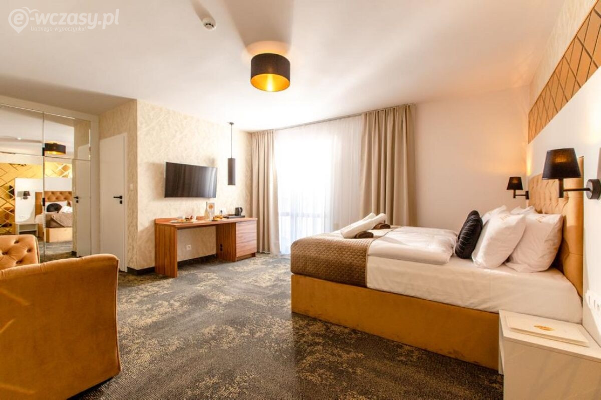 Gwarantujemy bogate wyposażenie pokoi – zestaw ręczników łazienkowych i basenowych, zestaw kosmetyków hotelowych, profesjonalna suszarka do włosów, chłodziarka, czajnik z zestawem cafe&tea.