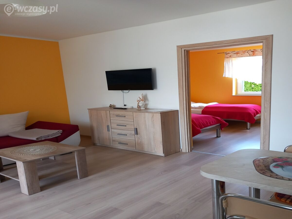 2.Salon ( rozkładany narożnik 2-osobowy, stolik kawowy, komoda, TV, WI-FI) z aneksem kuchennym (stół i krzesła, kuchenka , czajnik bezprzewodowy, lodówka, mikrofalówka, komplet naczyń,sztućców,garnki)