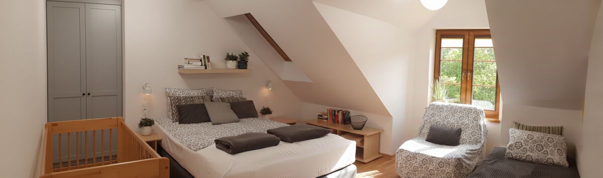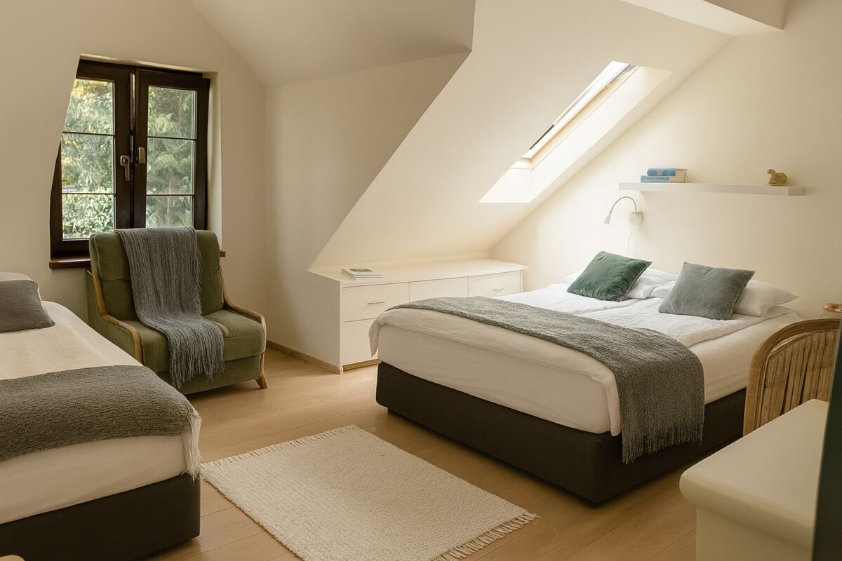 Na piętrze znajdą Państwo natomiast dwie duże sypialnie z osobnymi wejściami: