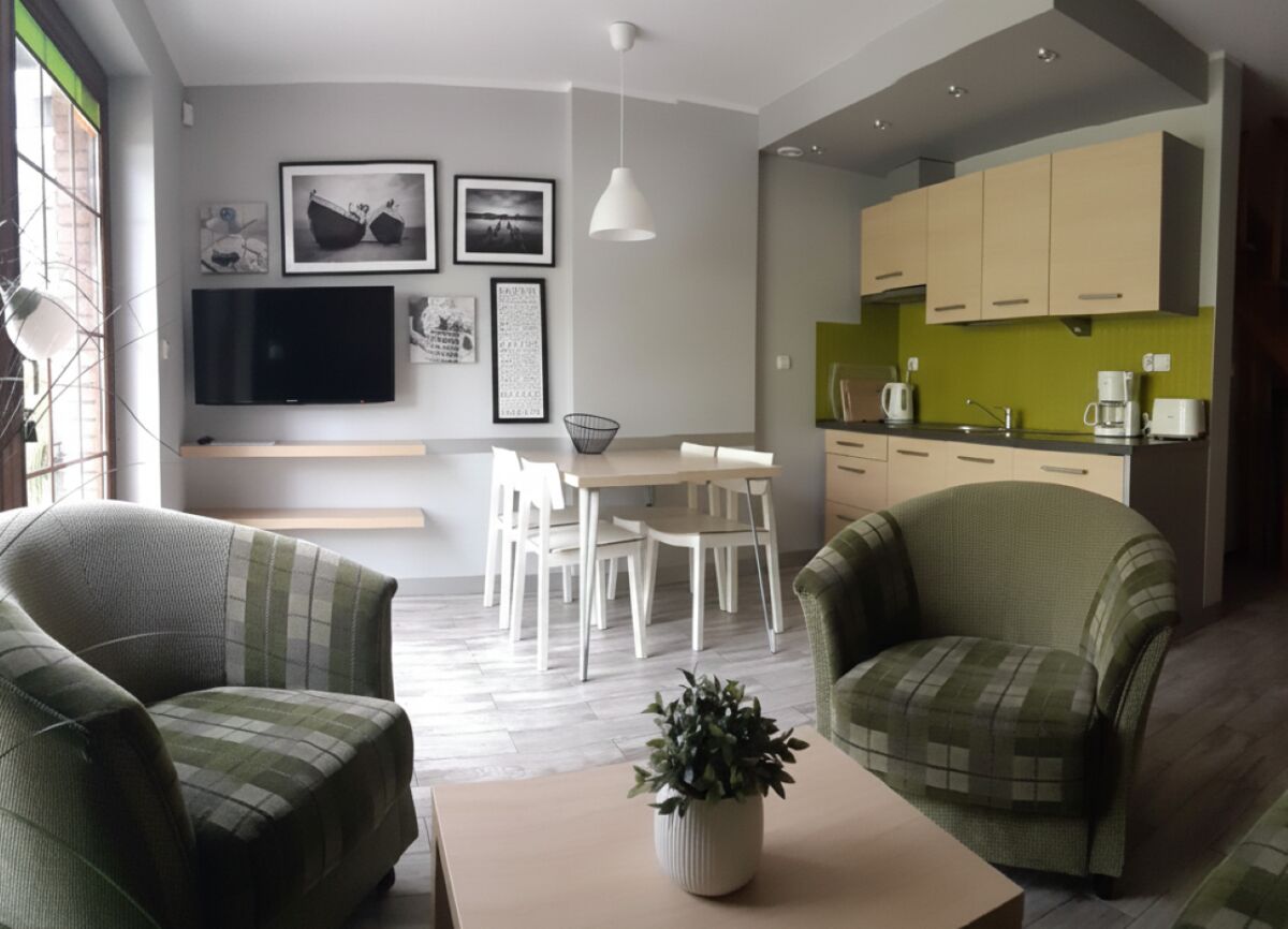 W każdym domku - apartamencie znajdą Państwo m.in. dobrze wyposażony aneks kuchnny (m.in. zmywarka, lodówka, mikrofalówka, minipiekarnik, expres do kawy, toster), TV - Sat, bezpłatny Internet Wi - Fi (światłowód) oraz sprzęt plażowy (leżak, parawan, mata plażowa). Do Państwa dyspozycji pozostawiamy również ogólnodostępną pralkę żelazko, deskę do pracowania. Na poziomie parteru podłoga wyłożona jest terakotą, na piętrze są drewniane panele (nie używamy dywanów)