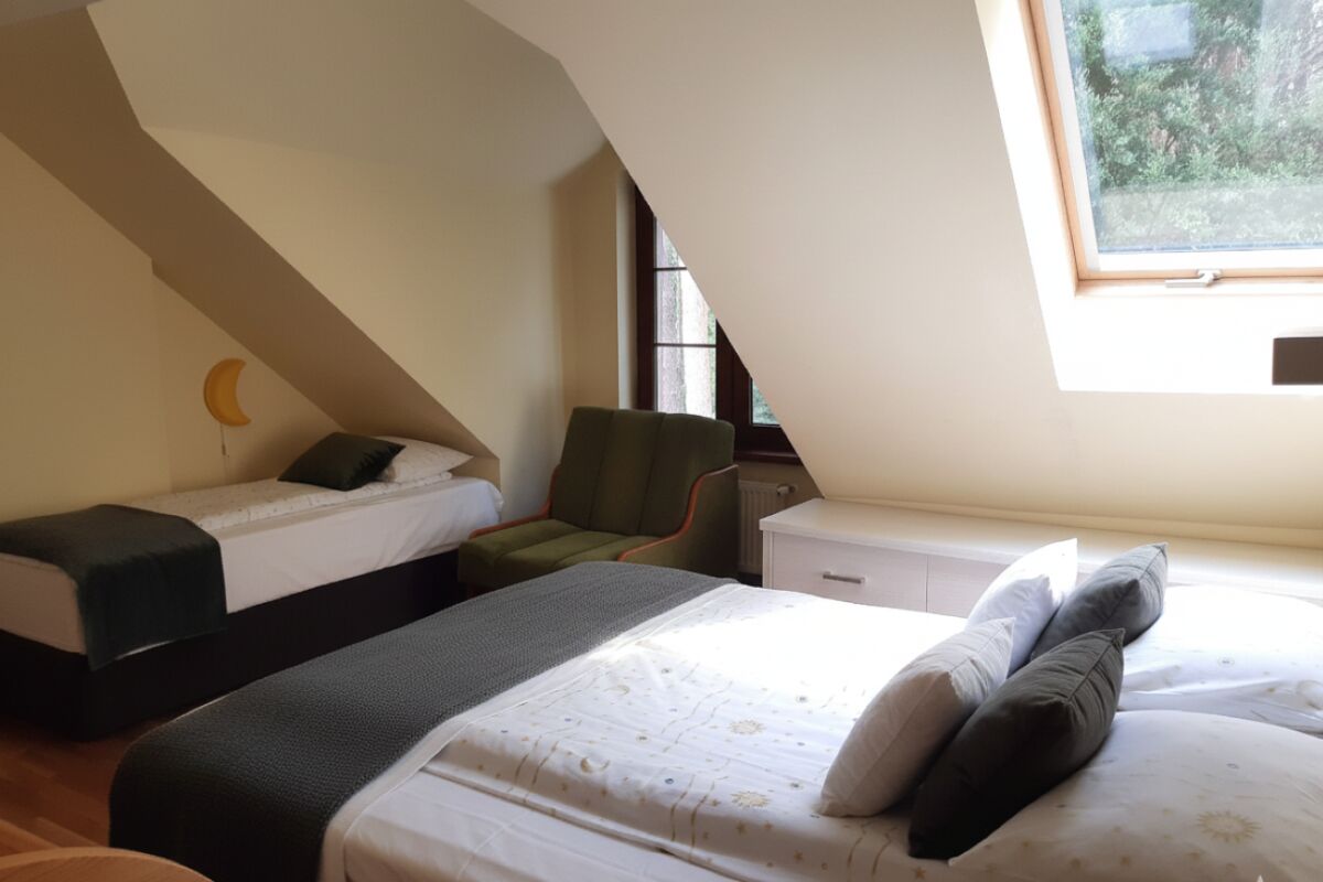 Na piętrze znajdą Państwo natomiast dwie małe sypialnie z osobnymi wejściami: