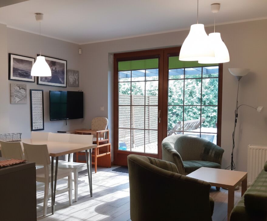 Domek ma bezpośrednie wyjście do ogrodu poprzez ndywidualny zadaszony taras, na którym do Państwa dyspozycji pozostają meble ogrodowe i grill. Widok na zieleń.
