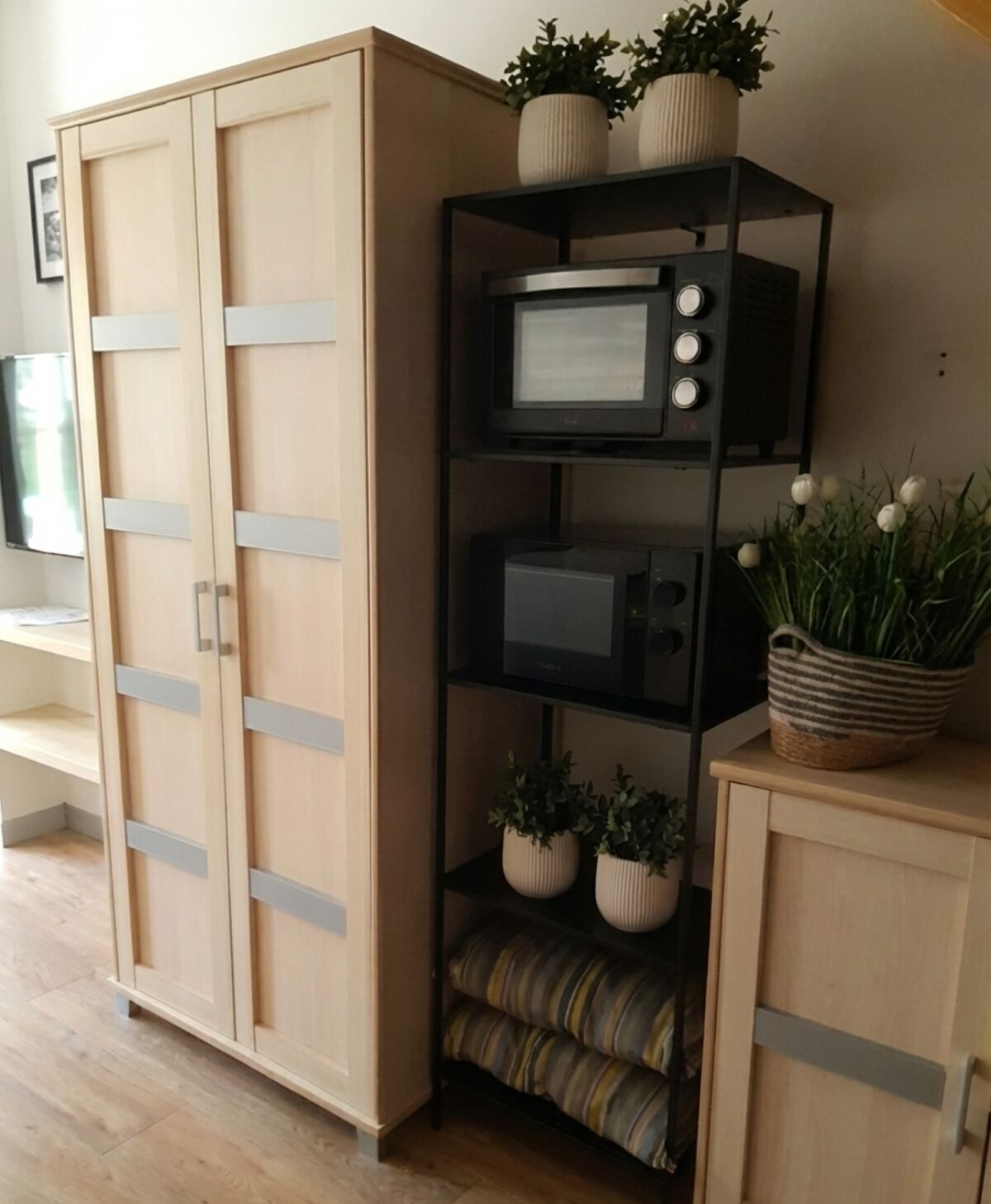 - wyposażenie aneksu kuchennego (kuchenka dwupalnikowa, zlew, lodówka, zmywarka, mikrofalówka, piekarnik mini, czajnik bezprzewodowy, garnki, talerze, sztućce, szklanki, filiżanki, kieliszki, drobne akcesoria kuchenne, środki czystości),