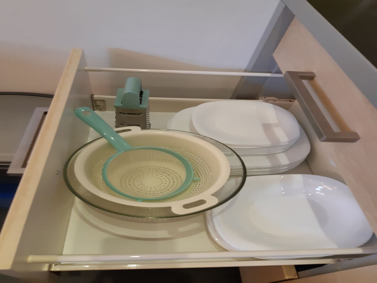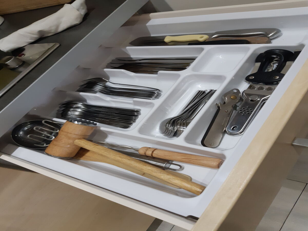 - wyposażenie aneksu kuchennego (kuchenka dwupalnikowa, zlew, lodówka, zmywarka, mikrofalóka, piekarnik mini, czajnik bezprzewodowy, garnki, talerze, sztućce, szklanki, filiżanki, kieliszki, drobne akcesoria kuchenne, środki czystości),