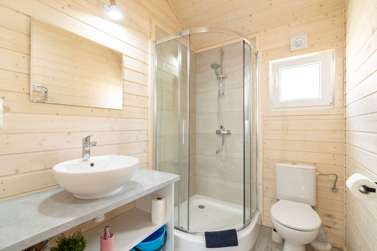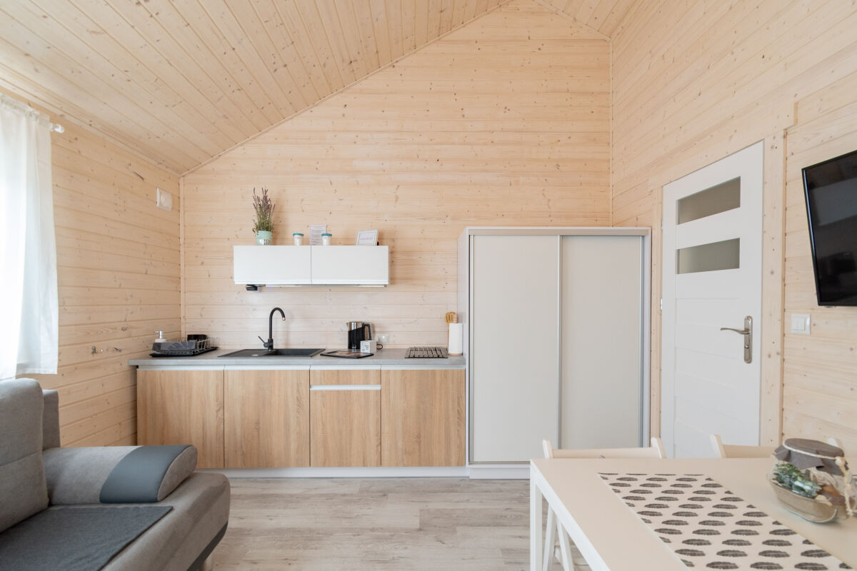 płyta indukcyjna, czajnik elektryczny, lodówka, szklanki, kieliszki, talerze, garnki, sztućce itp.