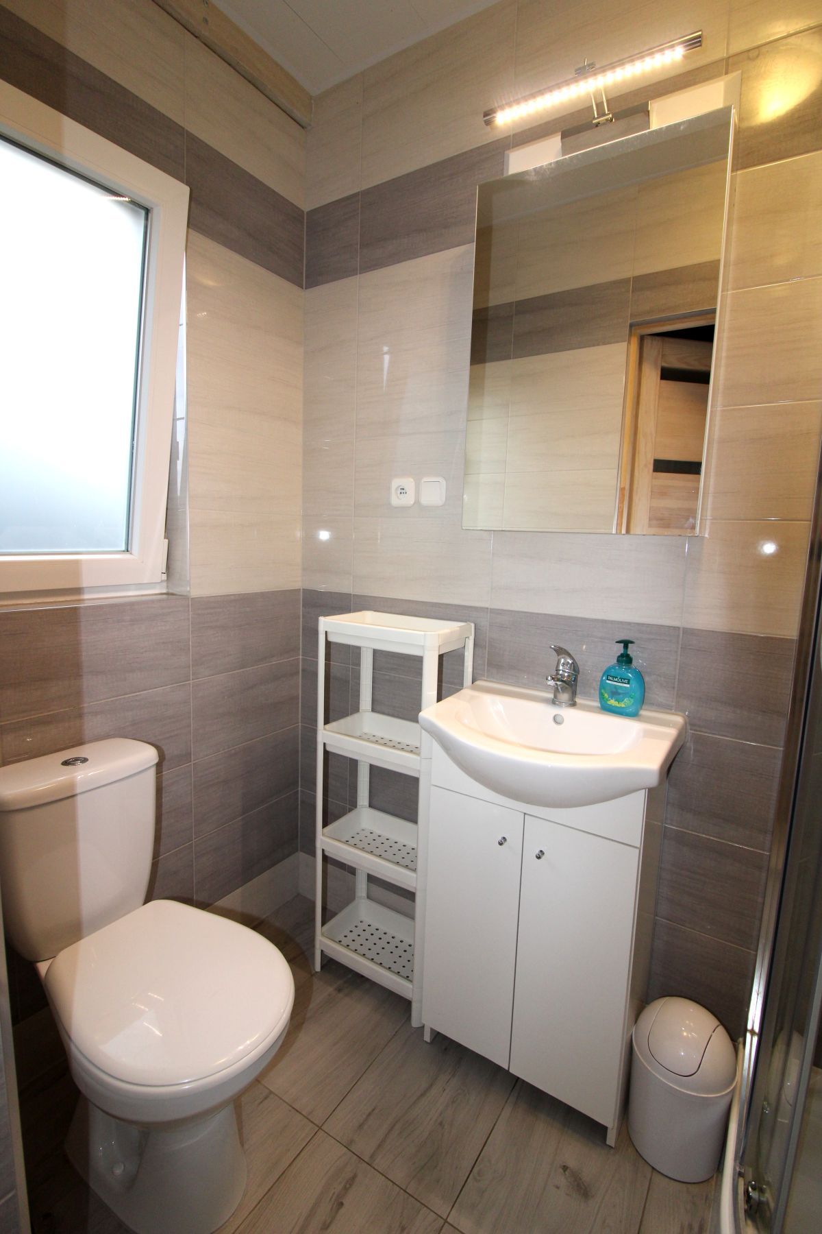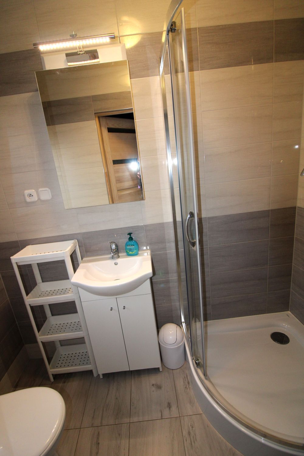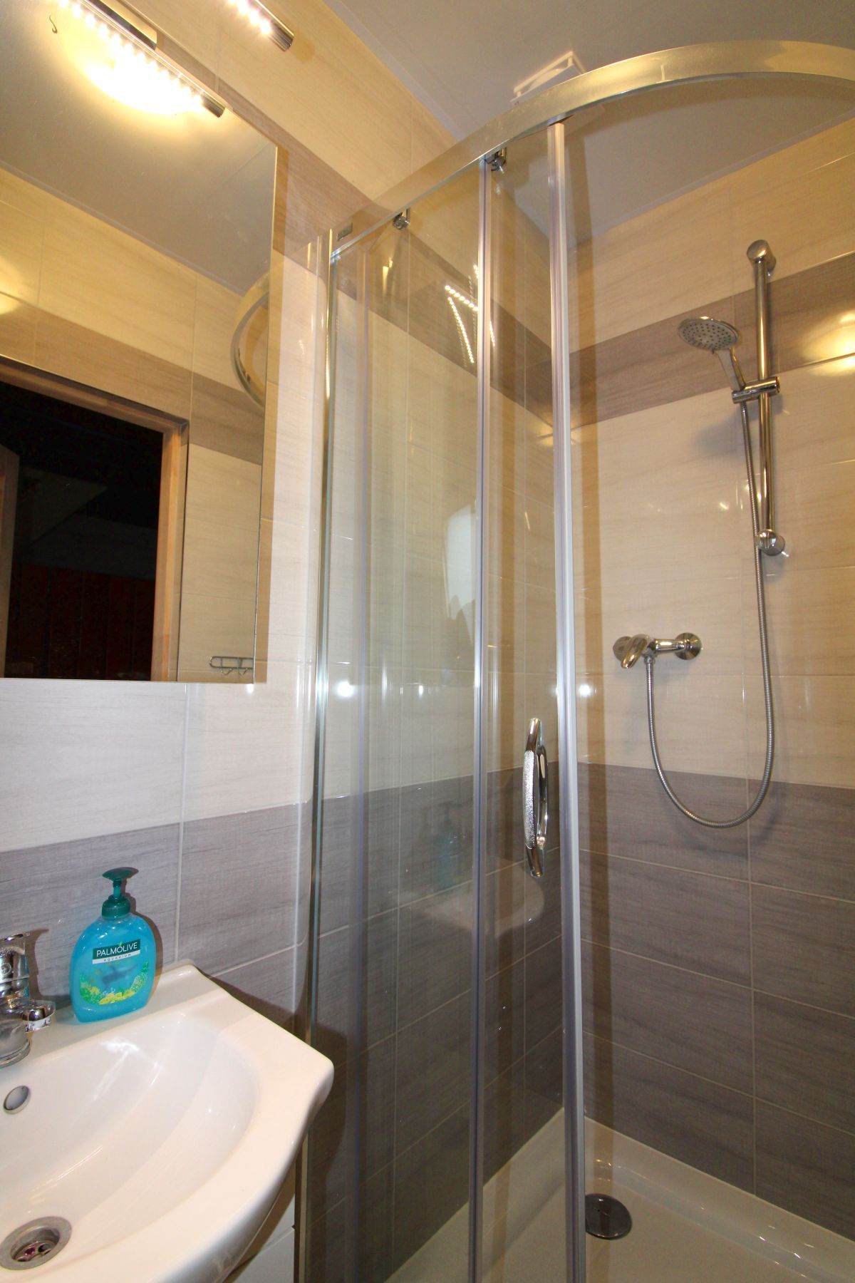nowoczesną łazienkę z kabiną prysznicową i dużym bojlerem (100 l)