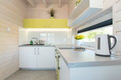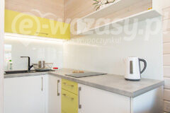 - aneks kuchenny - wyposażony w lodówkę, indukcyjną płytę grzejną, czajnik elektryczny, komplet garnków, patelnie, miski, zastawę stołową