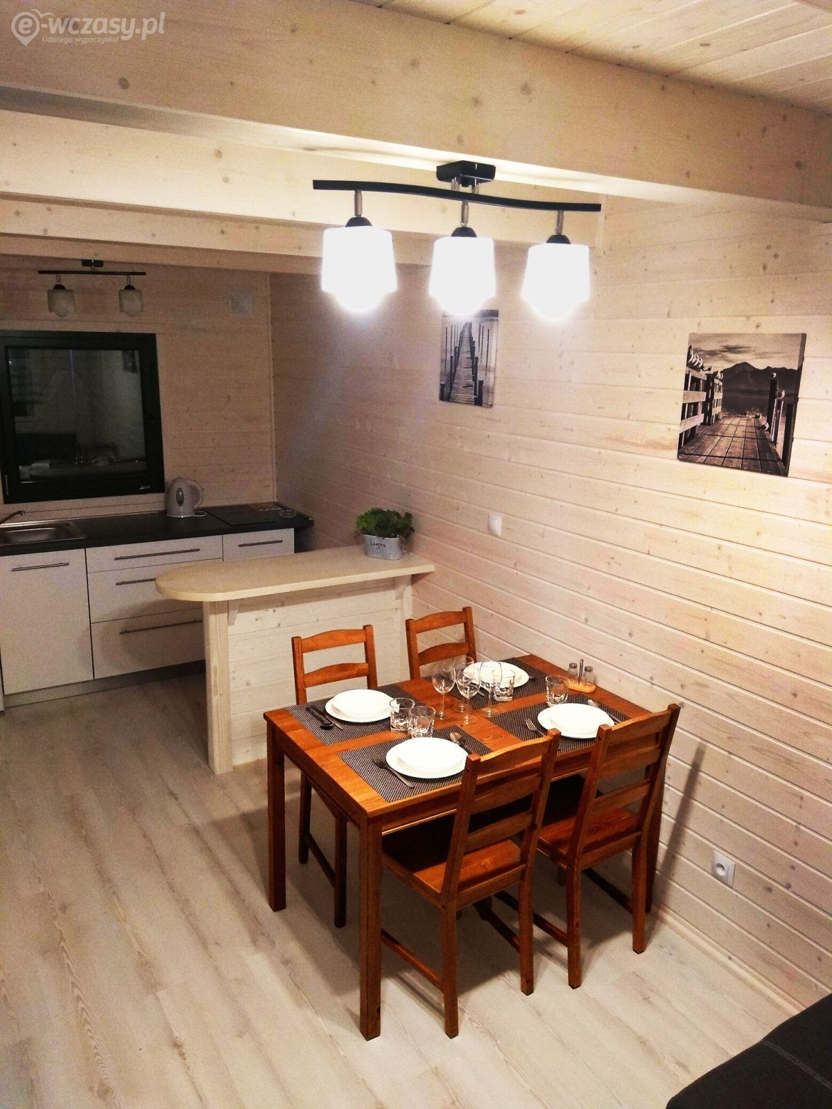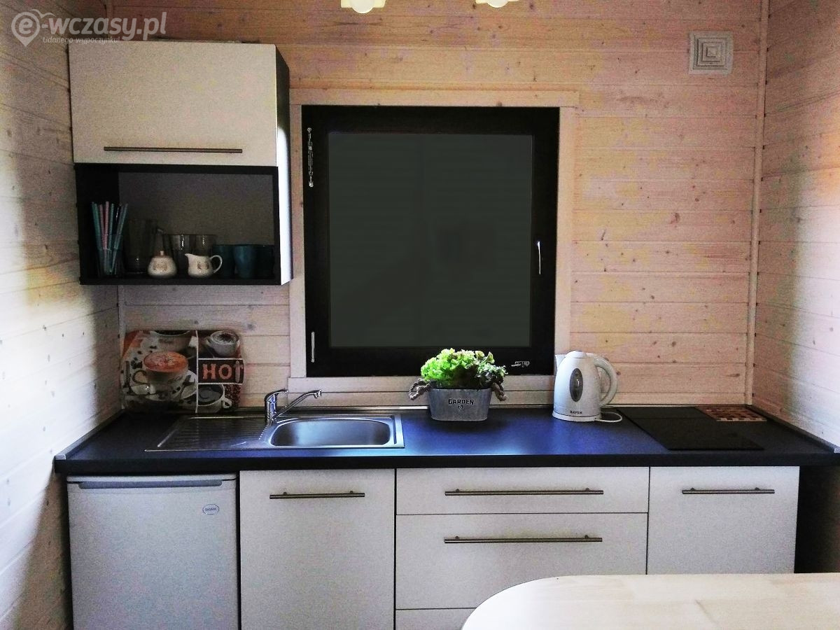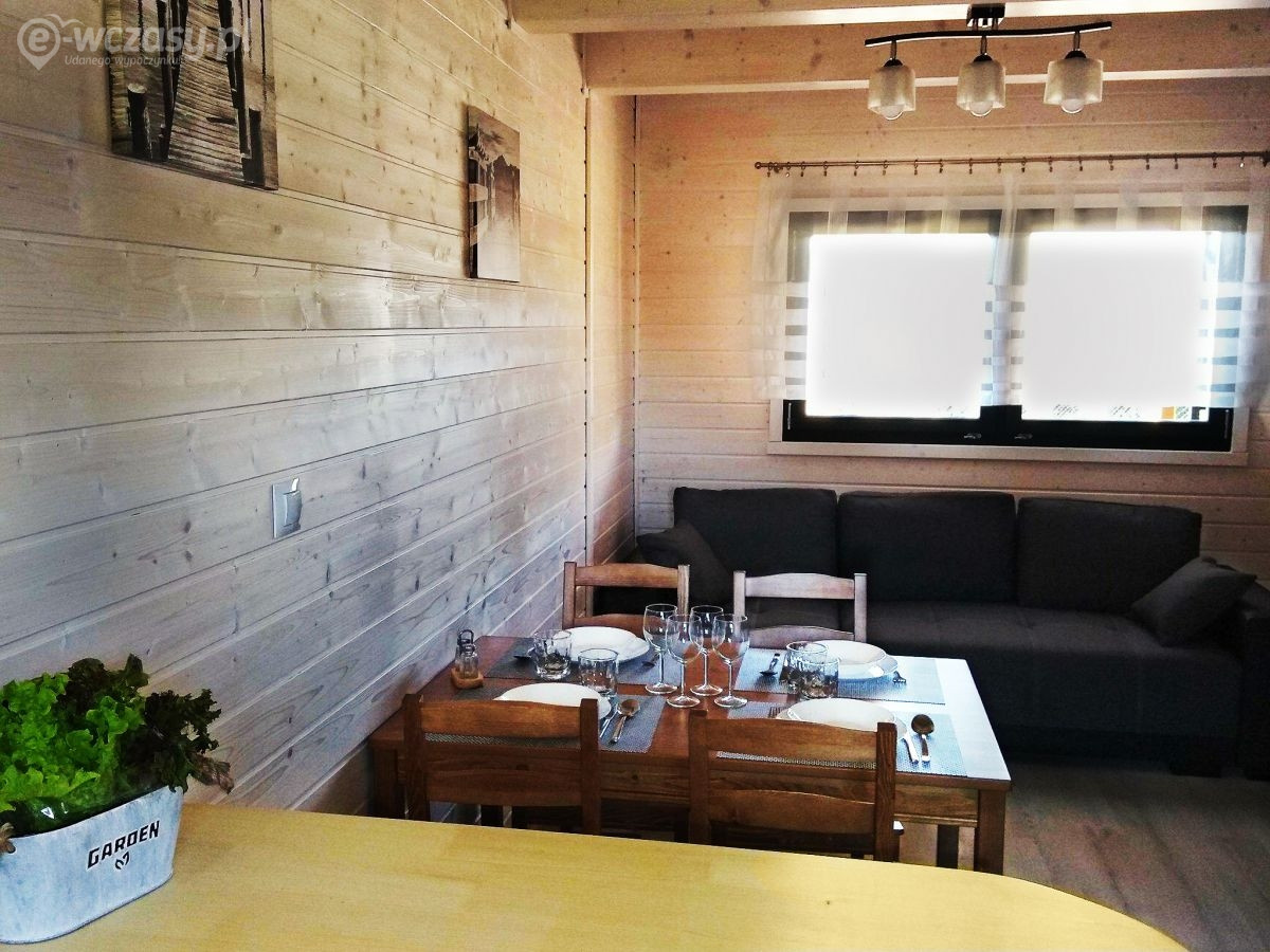 Domki wykonane w całości z drewna. Ocieplone, co stwarza dobry klimat zarówno w gorące miesiące letnie jak również w chłodniejszy czerwiec czy wrzesień. Na parterze znajduje się salon z rozkładaną kanapą ( narożnik ), TV , stołem z krzesłami aneksem kuchennym oraz dużą łazienką ( ponad 5m2 ). Aneks kuchenny wyposażony w lodówkę, płytę indukcyjną , kuchenkę mikrofalową, czajnik oraz pełną zastawę stołową (garnki, talerze, sztućce oraz kieliszki ). Na piętrze mieszczą się 2 oddzielne sypialnie . W każdej z nich znajdziecie państwo po 2 łóżka (szer. 140 i 120 cm ) komody, szafki nocne, lampki. Jeden pokój posiada dodatkowo duży balkon. Na piętrze dodatkowo mieści się garderoba.