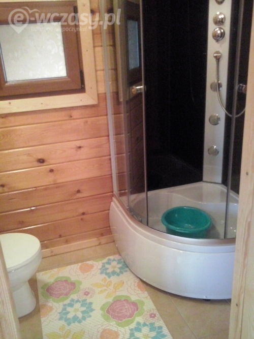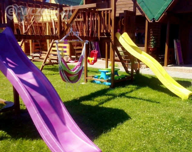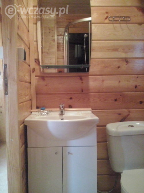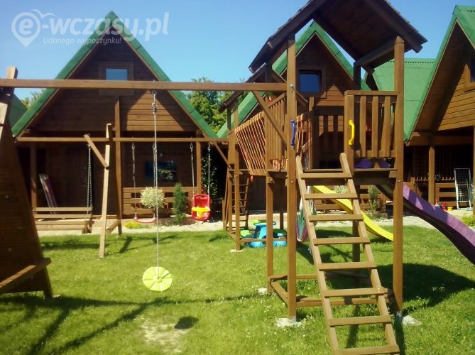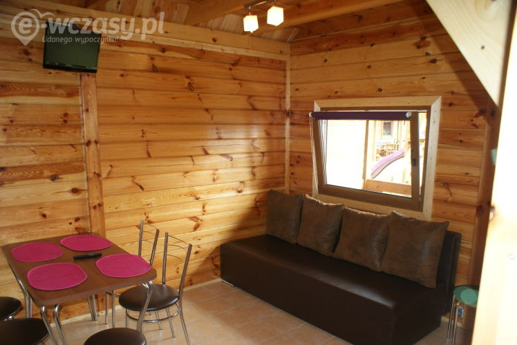 drewniane, komfortowo wyposażone DOMKI 6- osobowe parter: salonik z aneksem kuchennym z pełnym wyposażeniem /kuchenka elektryczna, lodówka, mikrofalówka, czajnik, zastawa stołowa, garnki, patelnia, sztućce, telewizor, stół, krzesła, sofa rozkładana, łazienka - kabina prysznicowa, szafka z umywalką, wc piętro: 2 oddzielne sypialnie /w każdej z nich znajduje się łóżko małżeńskie oraz pojedyncze, komoda, lampa nocna/ bramka zabezpieczająca na schody