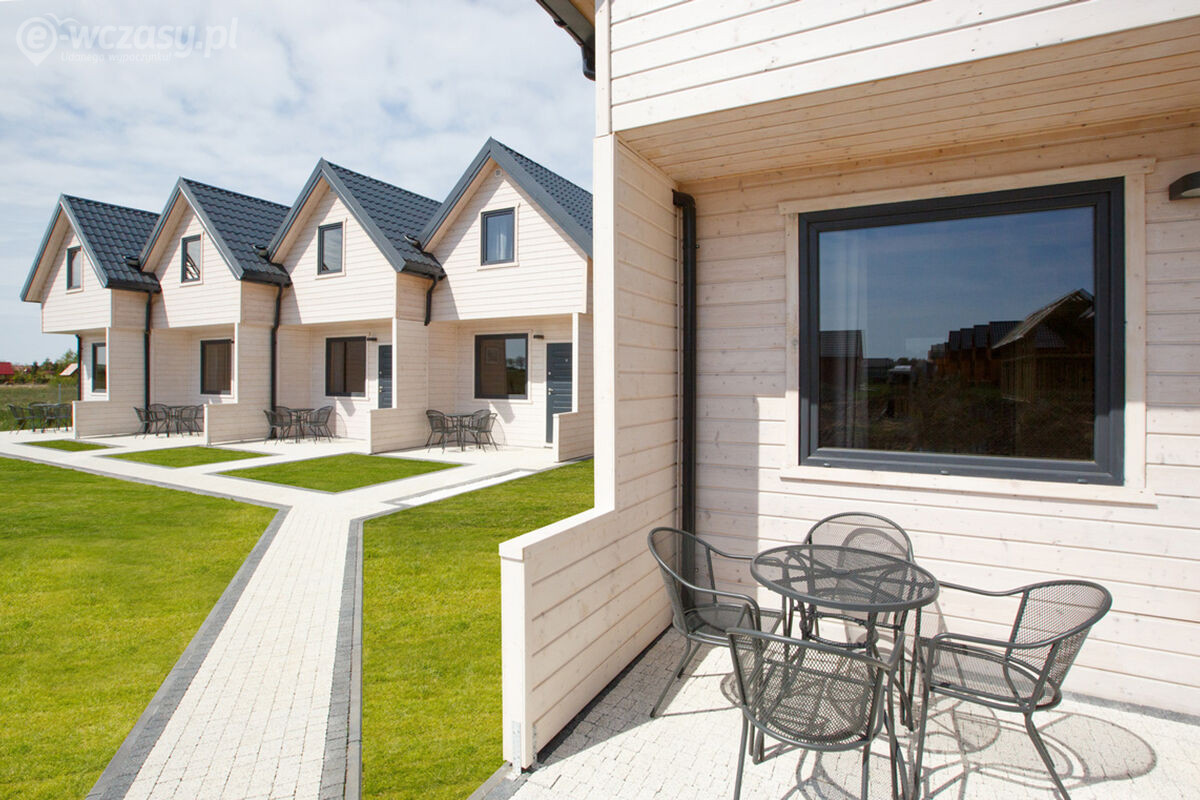 Na zewnątrz: przed każdym domkiem znajduje się taras z meblami ogrodowymi.