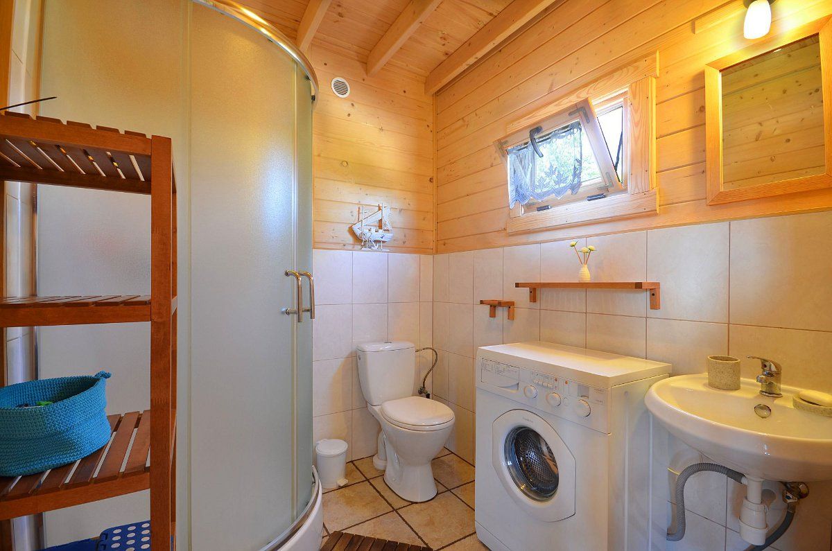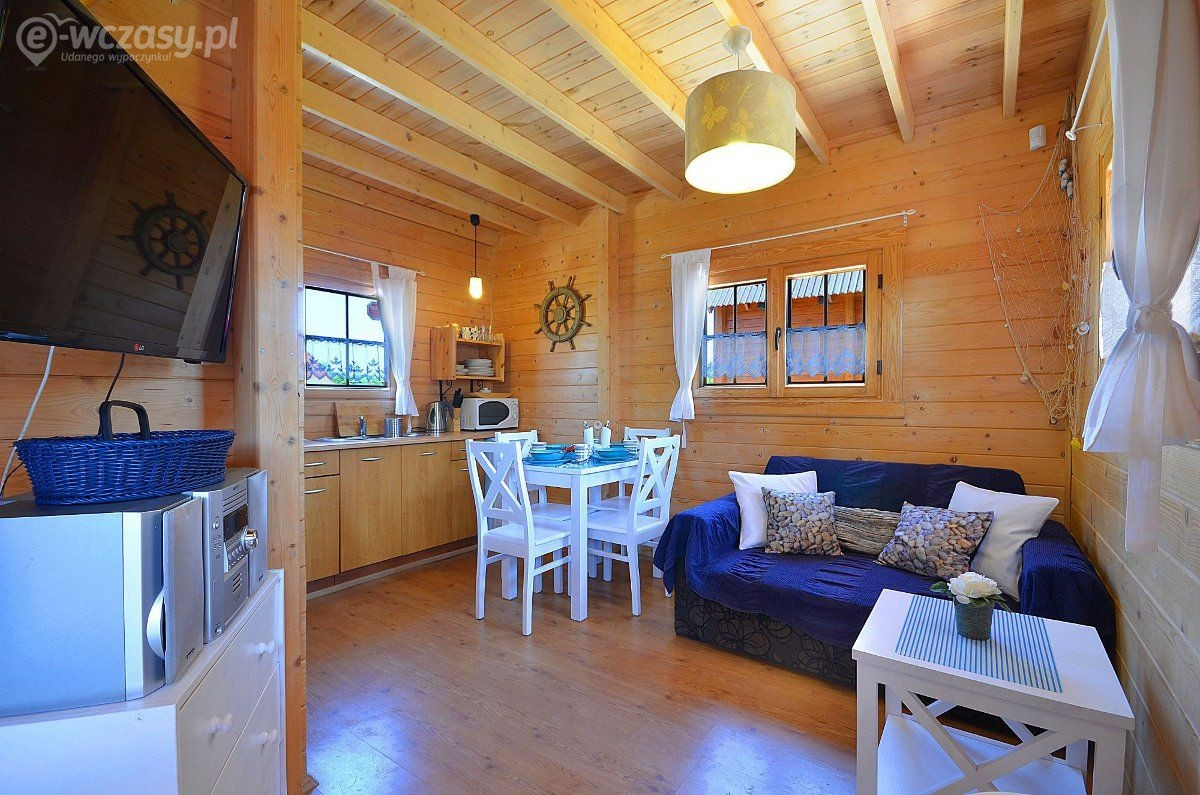 Na naszych gości czeka 6 piętrowych domków letniskowych – każdy dla 6 osób. Domki te są wykonane z bala drewnianego, posiadają własne tarasy z kompletem mebli ogrodowych z drewna, są doskonałe do urządzenia śniadań na świeżym powietrzu i popołudniowy relaks. Każdy domek jest w pełni wyposażony – posiada osobny salon, 2 sypialnie, łazienkę, aneks kuchenny. Domki mają własne ogrzewanie elektryczne oraz pralki automatyczne,zestawy do prasowania , na ich wyposażeniu są ponadto zestawy plażowe (2 parawany, 2 leżaki i 2 koce).