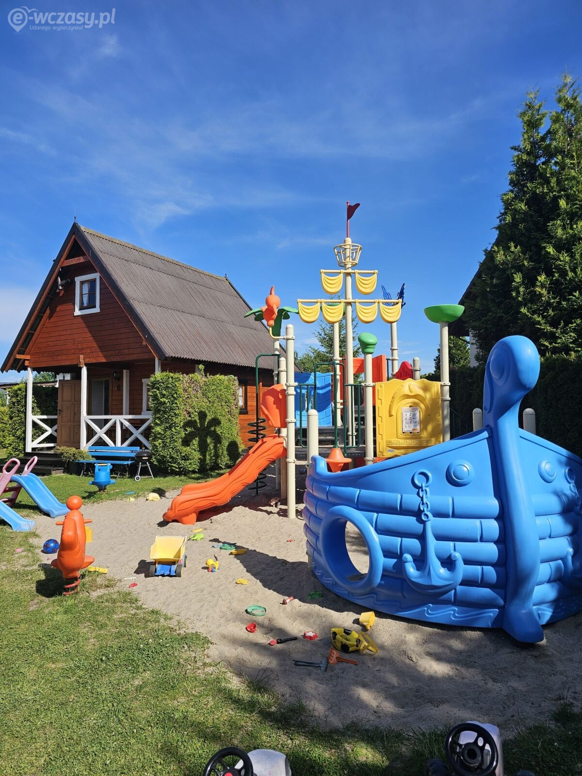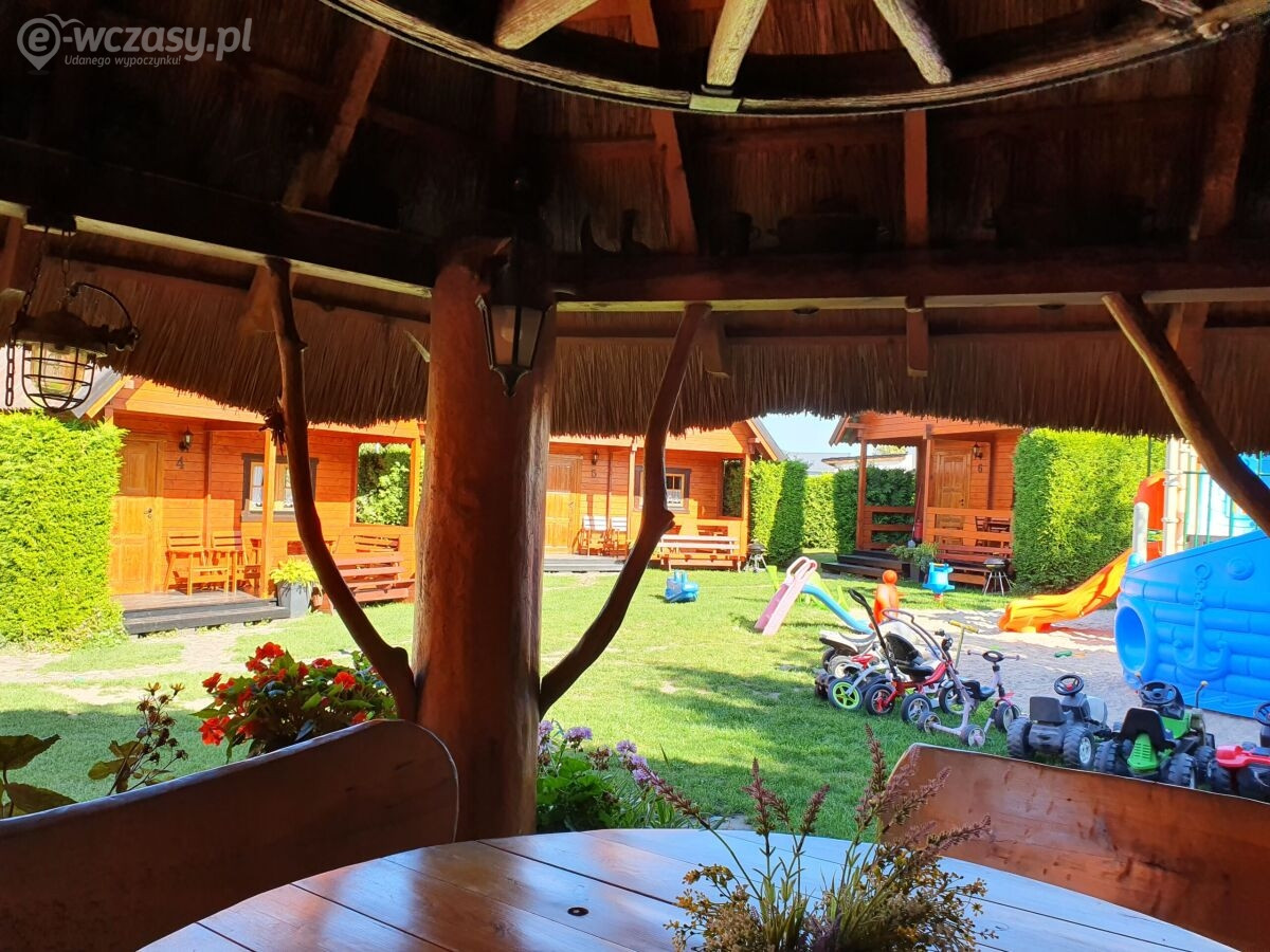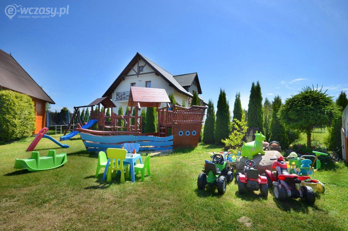 Dla dzieci- Nie zapominamy też o naszych najmłodszych gościach. Czeka u nas bezpieczne miejsce zabaw dla najmłodszych – trampolina, piaskownica, zjeżdżalnia, huśtawki, ławeczki i stoliczki i mnóstwo zabawek. Dostępne jest też boisko do gry w siatkówkę oraz profesjonalny stół do gry w ping-ponga. Na specjalne życzenie oferujemy także łóżeczka turystyczne do wypożyczenia, wanienkę oraz specjalne krzesełko do karmienia bez żadnych opłat – prosimy o zaznaczenie tego przy rezerwacji, a my przygotujemy je dla Państwa. W każdym domku jest też kosz zabawek